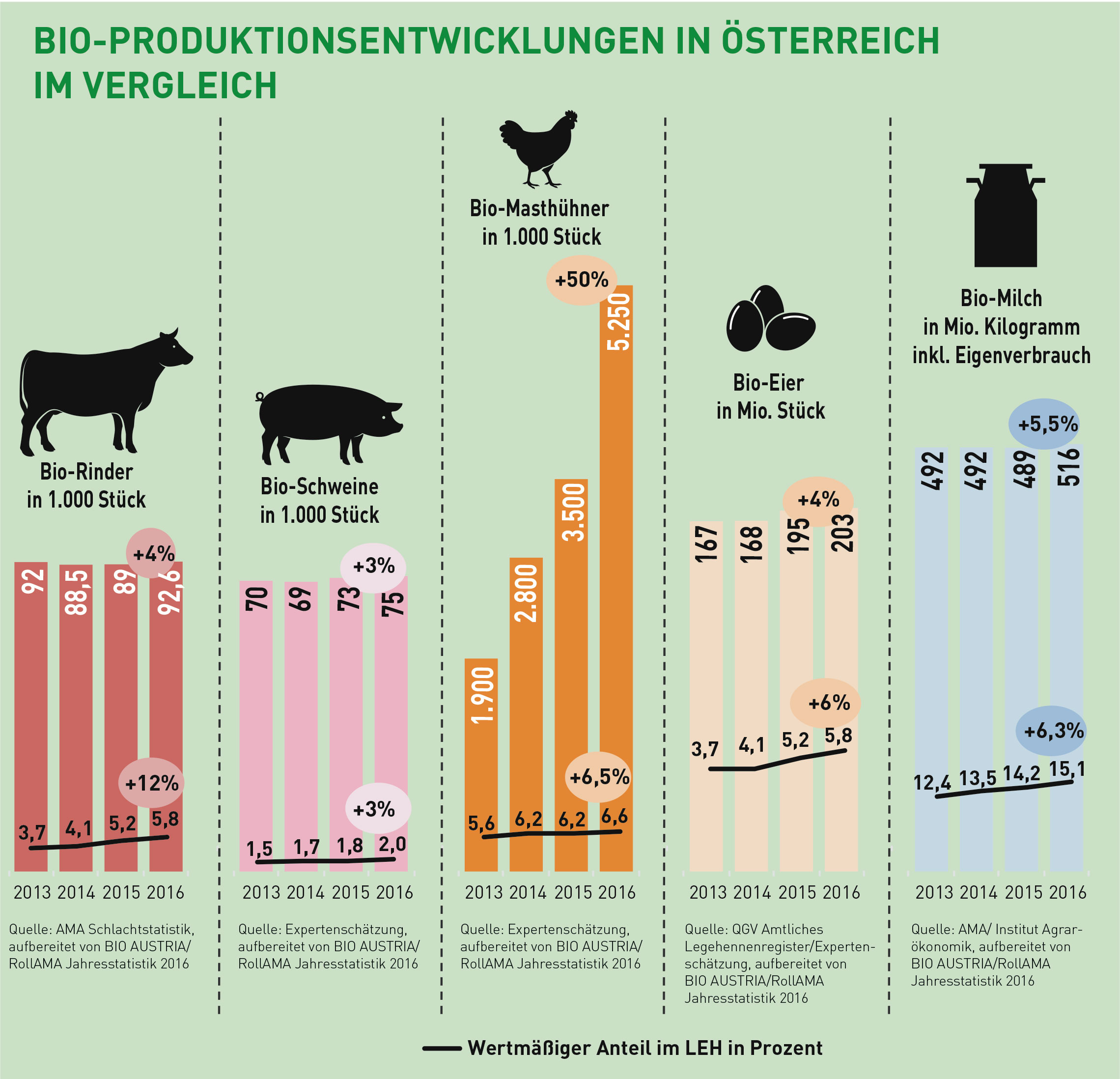 Die nachhaltige Entwicklung des Bio-Sektors in Österreich lässt sich auch anhand einer Gegenüberstellung von aktuellen Produktions- und Absatzdaten veranschaulichen: So hat etwa die Produktion im Bio-Schweinebereich 2016 um drei Prozent zugelegt. Im gleichen Zeitraum stieg der Absatz von Bio-Schweinefleisch im Lebensmitteleinzelhandel (LEH) ebenfalls um drei Prozent (wertmäßig). Vier Prozent mehr Bio-Rindfleisch standen 2016 einem Absatzplus im LEH von 12 Prozent gegenüber. Auch die Bio-Eier Produktion wuchs um vier Prozent, während im LEH etwa sechs Prozent Zuwachs zu verzeichnen waren. Bei der Bio-Milch gehen das Produktionswachstum mit einem Zuwachs von 5,5 Prozent und das Absatz-Plus in Höhe von 6,3 Prozent ebenfalls Hand in Hand.