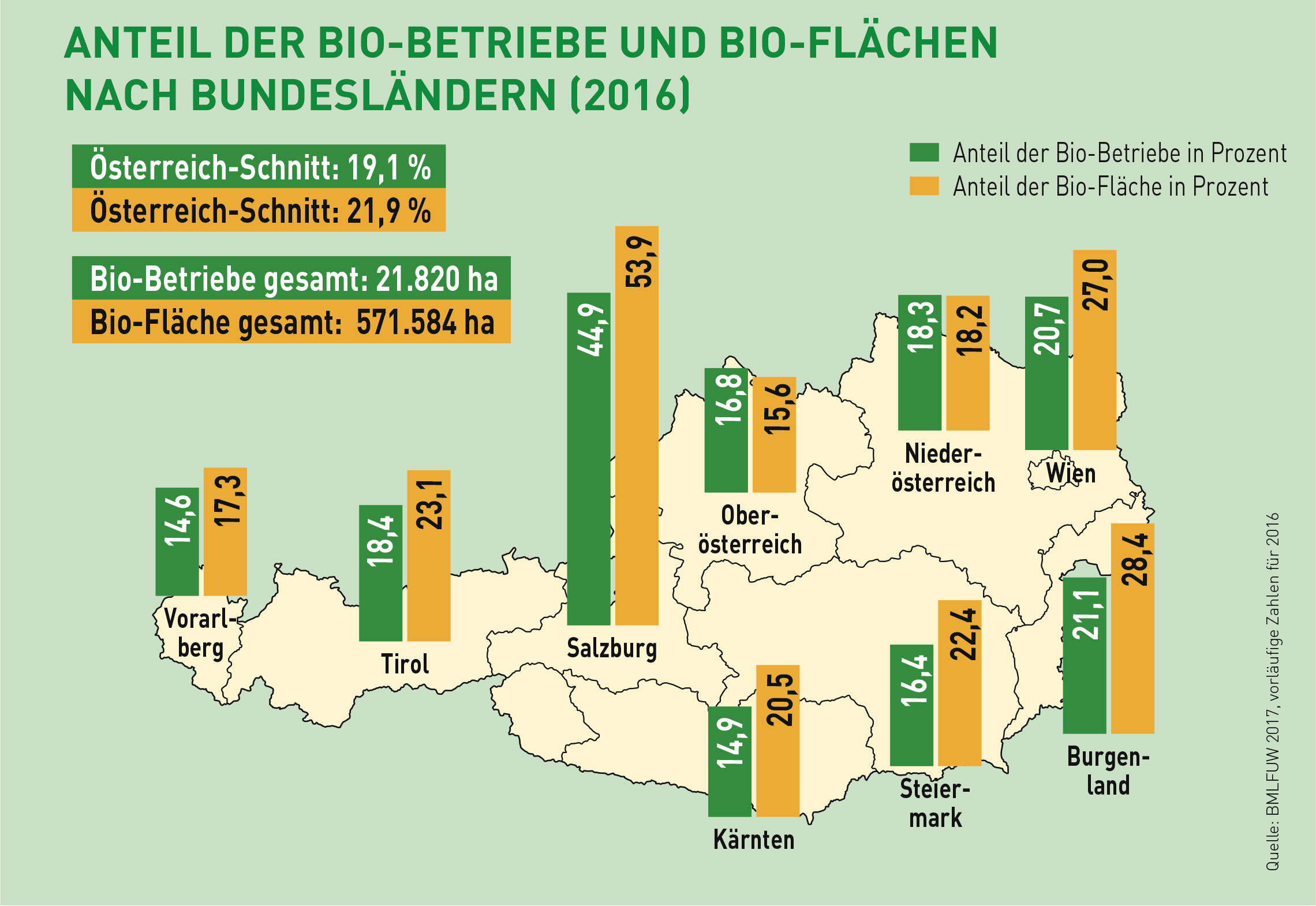 Im Schnitt sind 2016 pro Tag fünf Betriebe neu in die Bio-Landwirtschaft eingestiegen. Insgesamt gab es im vergangenen Jahr in Österreich 21.820 Bio-Betriebe. Das entspricht einem Anteil von 19 Prozent an allen landwirtschaftlichen Betrieben. Mit dem Anstieg der Betriebe wächst auch die biologisch bewirtschaftete landwirtschaftliche Nutzfläche konstant: 571.585 Hektar wurden 2016 biologisch bewirtschaftet, was einem Anteil von 22 Prozent der gesamten landwirtschaftlichen Nutzfläche entspricht. "Damit ist sowohl die Zahl der Betriebe als auch die biologisch bewirtschaftete Fläche gegenüber 2015 um je fünf Prozent gewachsen. Mehr als jeder fünfte Hektar in Österreich wird mittlerweile nach Bio-Richtlinien bewirtschaftet", betonte Grabmann.