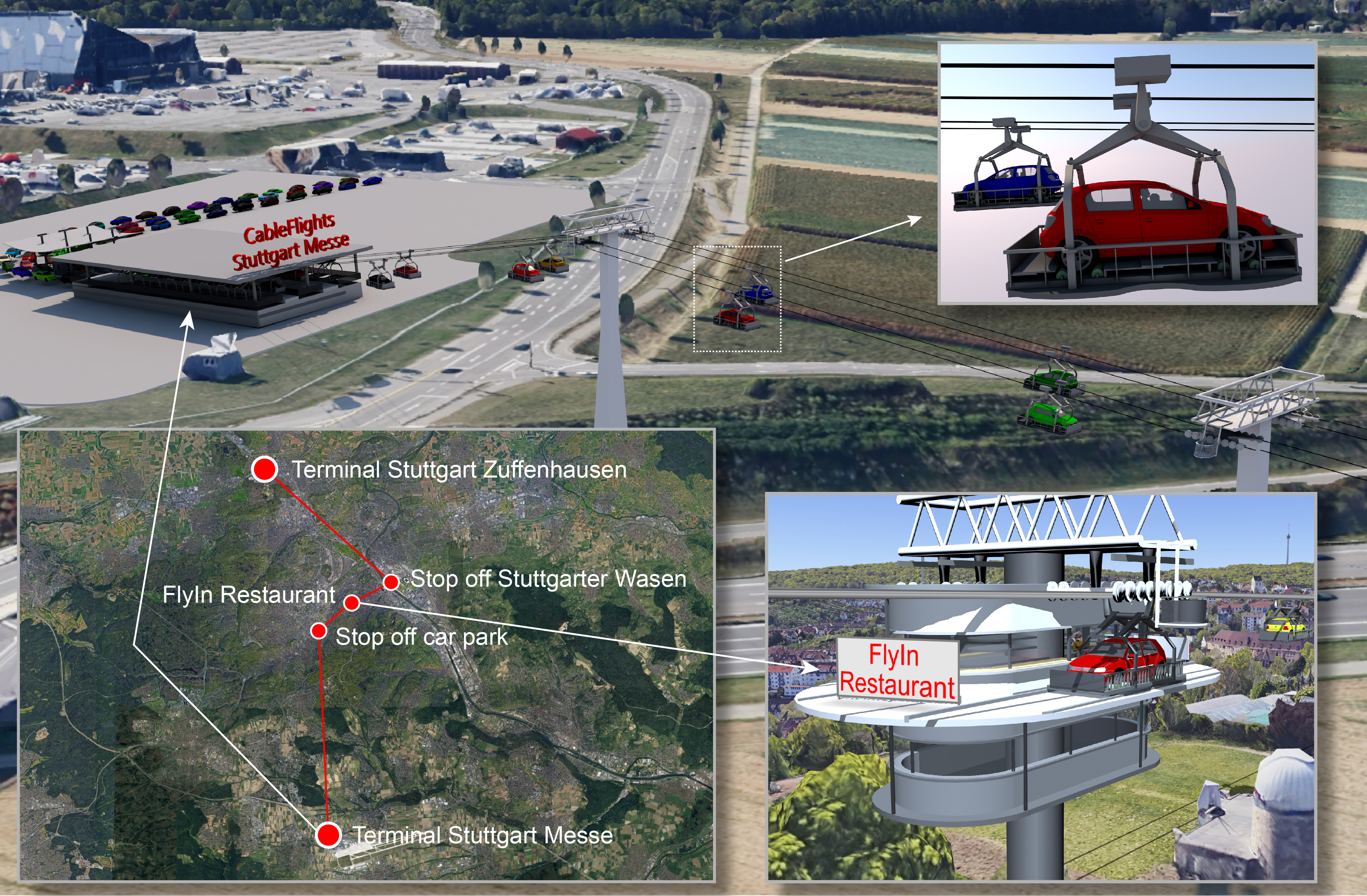Die Verkehrsprobleme in Großstädten nehmen mit den damit einhergehenden Umweltproblemen von Tag zu Tag zu. Ein Teil einer Gesamtlösung kann ein CableFlights-System sein, mit dem Autos und deren Insassen in die Innenstädte und von dort wieder hinaus transportiert werden. Während des Flugs werden die Fahrzeuge klimatisiert. Außerdem können Elektro-Autos während des Flugs betankt werden. Last but not least gibt es unterwegs noch ein FlyInRestaurant. Mittels einer App können die Fluggäste auf ihrem Flug Speisen und Getränke bestellen, die ihnen durch die Fenster während der Fahrt ins Auto gereicht werden.