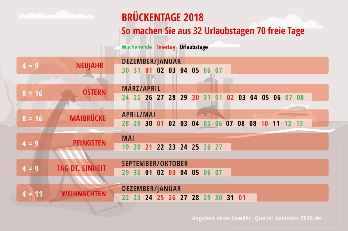 Neujahrsbrücke: Nehmen Sie sich vom 2. bis 5.Januar frei, damit können Sie ganze 9 Tage Freizeit ergattern. Pfingstbrücke: Der Pfingstmontag fällt auf den 21. Mai: nehmen Sie sich den Rest der Woche frei und erhalten Sie mit den Wochenenden davor und danach 9 freie Tage. Einheitsbrücke: Der Tag der dt. Einheit fällt auf einen Mittwoch. So werden aus 4 Urlaubstagen 9 freie Tage.