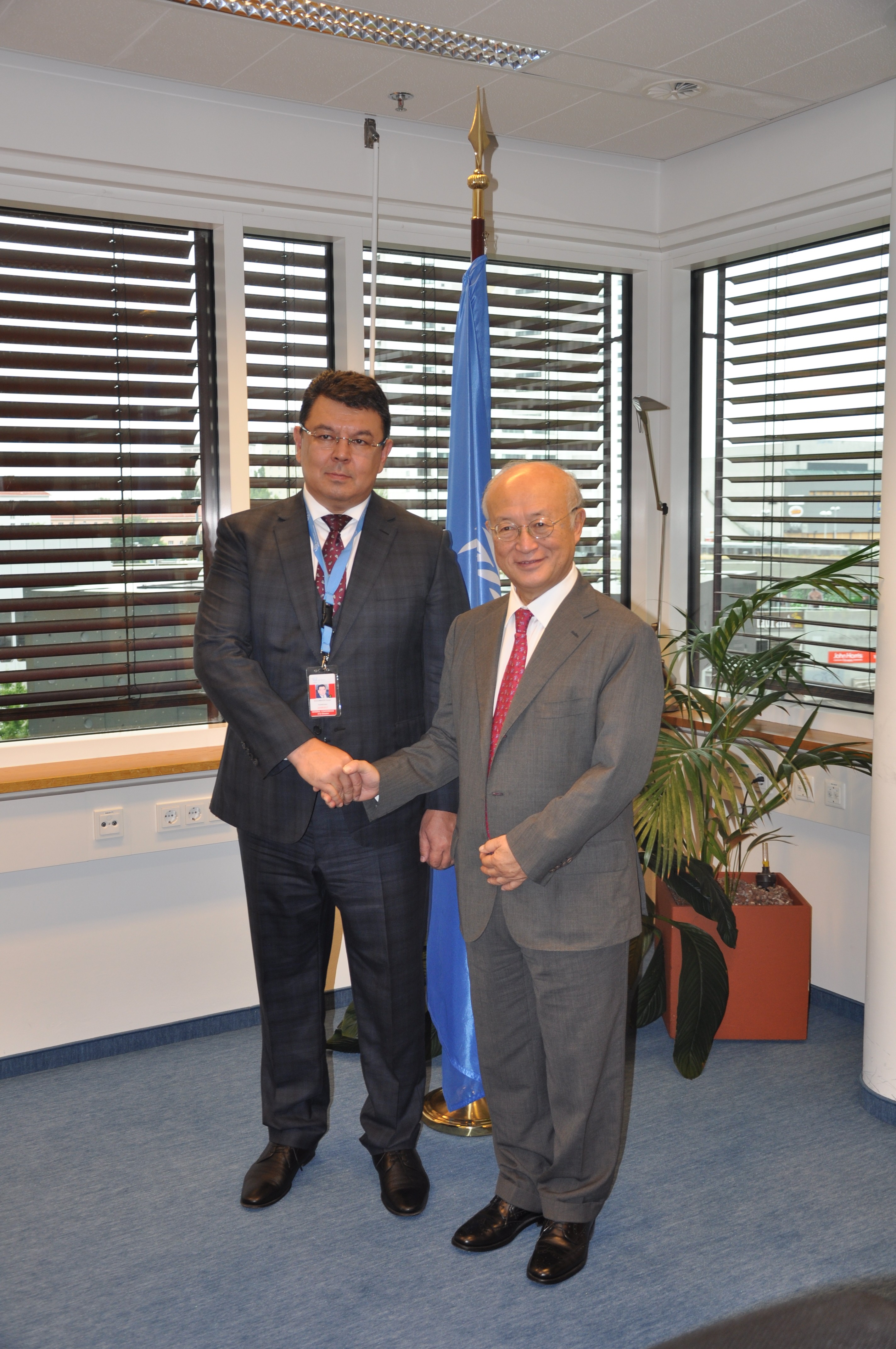 Der kasachische Energieminister K. Bozumbaev und IAEA Director General Y. Amano präsentierten gemeinsam eine Fotoreihe, welche der Inbetriebnahme des Gebäudes der IAEA LEU Bank in Kasachstan gewidmet war. K. Bozumbaev übergab dem Director General der IAEA ein Modell des Gebäudes als Geschenk unseres Landes.