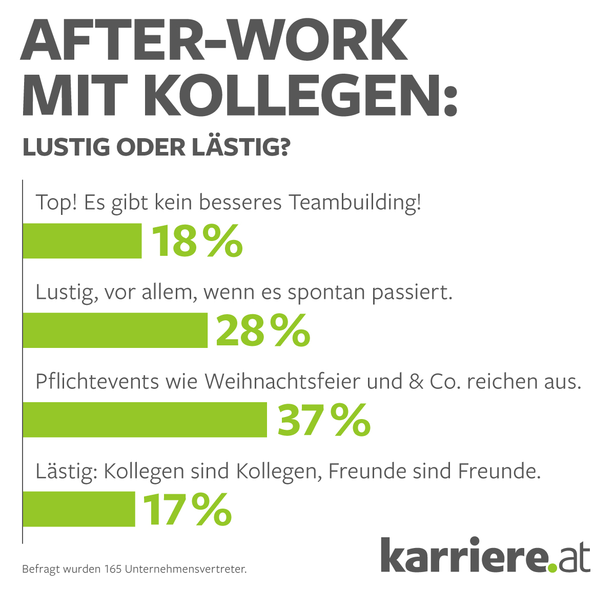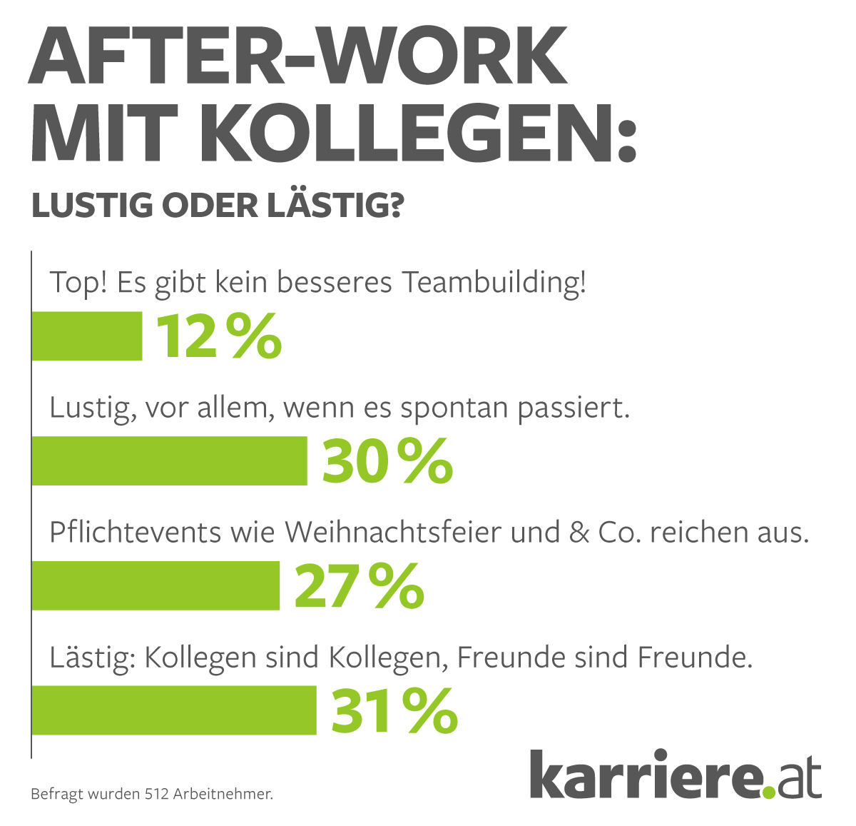 „Wir gehen noch auf ein Bier nach der Arbeit – du kommst eh mit, oder?“ Nicht alle Kollegen reagieren begeistert auf solche Fragen. Das aktuelle Online-Voting von karriere.at auf Arbeitnehmerseite zeigt nämlich, dass nur 12 Prozent der Befragten immer gern dabei sind und darin optimales Teambuilding sehen. Knapp jeder Dritte (30 Prozent) findet Kollegen-Kontakt nach Dienstschluss vor allem dann lustig, wenn die Initiative spontan geschieht. Ein Viertel (27 Prozent) hält „Pflichtevents“ wie Weihnachtsfeier oder Sommerfeste für ausreichend. 31 Prozent – und damit die meisten befragten Arbeitnehmer – gehen noch weiter und sagen: „Lästig: Kollegen sind Kollegen, Freunde sind Freunde“.