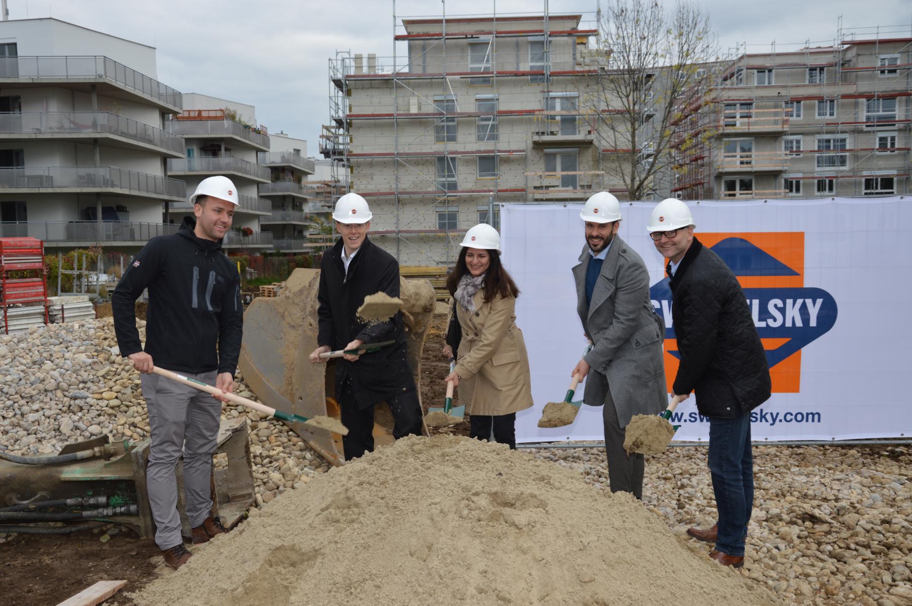 Mit erhobenen Schaufeln wurde der Baustart der 86 vom Land Wien im Rahmen des WWFSG geförderten Wohnungen eingeleitet. Die Planung ist bereits weit fortgeschritten und können die Wohnungen voraussichtlich schon im Frühjahr 2019 an die künftigen Bewohner übergeben werden.