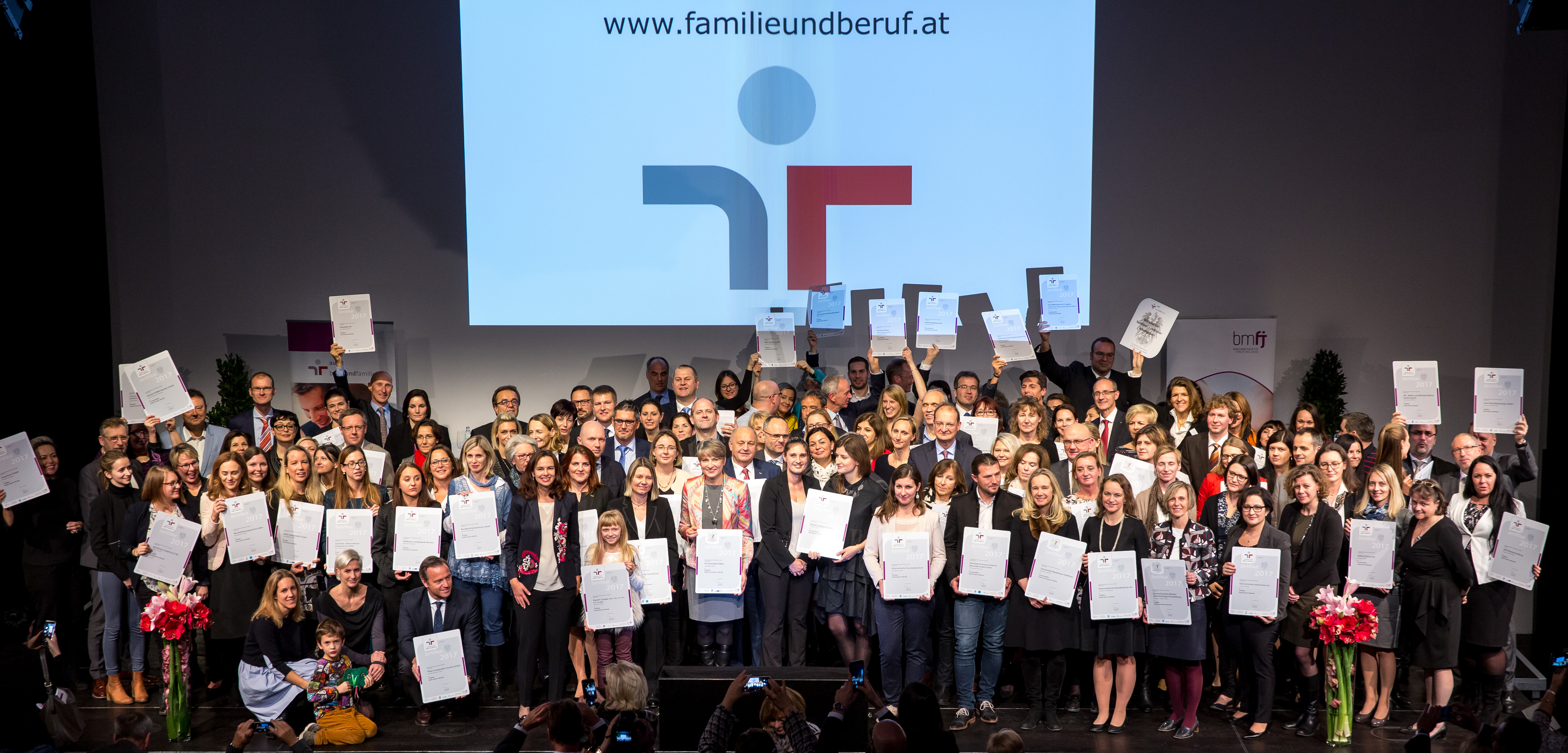 Unter dem Motto „Gemeinsam für mehr Familienfreundlichkeit“ überreichte Familienministerin Sophie Karmasin gestern Abend im Rahmen einer festlichen Veranstaltung am Erste Campus Wien das staatliche Gütezeichen Audit berufundfamilie und hochschuleundfamilie an insgesamt 76 Unternehmen und Institutionen. „Familienfreundlichkeit entwickelt sich immer mehr zu einem entscheidenden Wettbewerbsfaktor für einen erfolgreichen Standort. Die ausgezeichneten Unternehmen und Hochschulen haben das erkannt und mit großem Engagement vielfältige familienfreundliche Maßnahmen entwickelt oder bereits umgesetzt. Damit leisten sie einen wichtigen Beitrag auf unserem Weg, Österreich bis 2025 zum familienfreundlichsten Land Europas zu machen“, betont die Familienministerin.