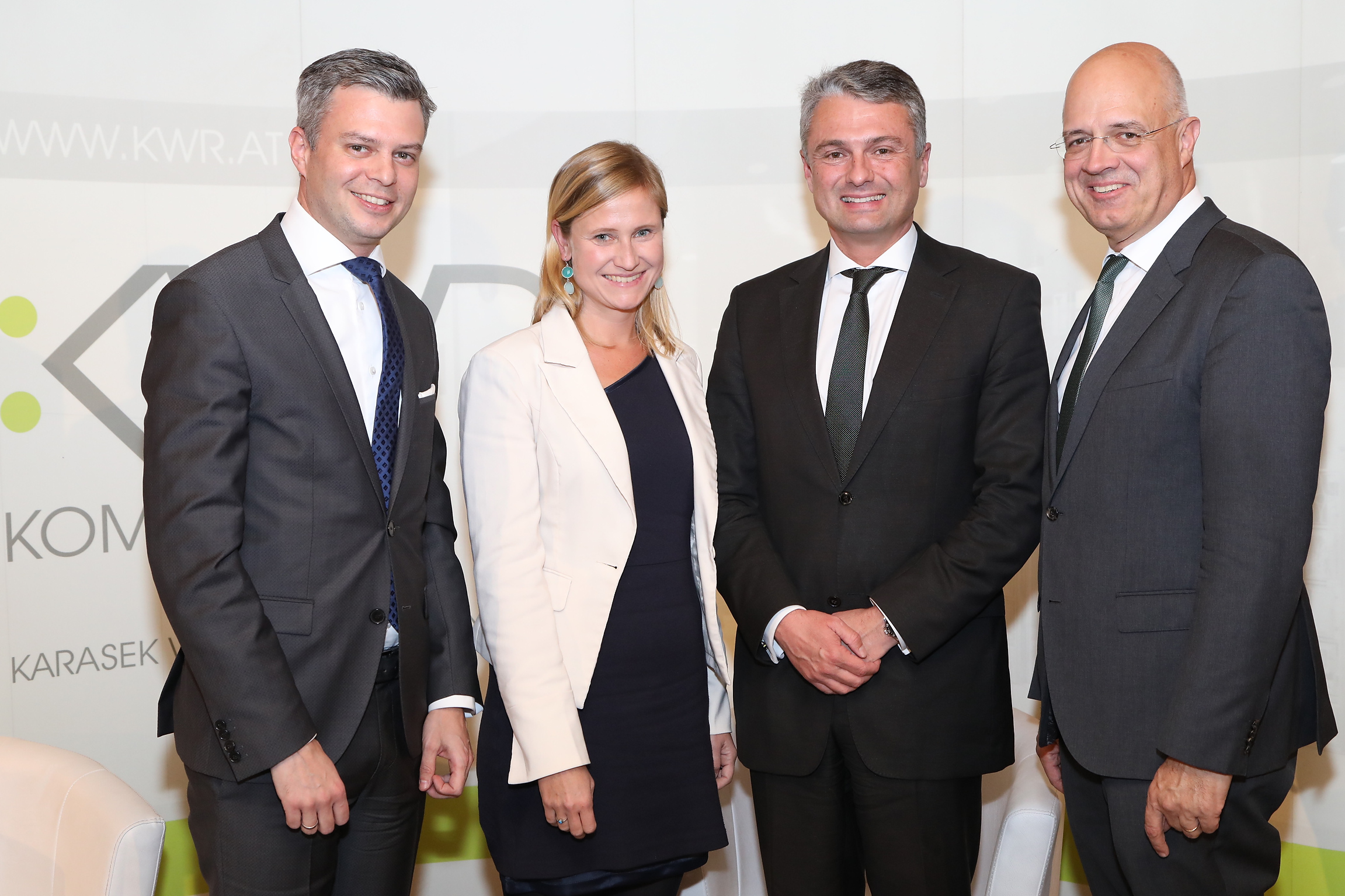 Mag. Thomas Arnoldner (Mitglied der Geschäftsführung der T-Systems Austria GesmbH,VP Sales & Service), Univ.-Prof. Dr. Wolfgang Mazal (Vorstand des Instituts für Arbeits- und Sozialrecht, Universität Wien), RA Dr. Anna Mertinz (KWR Arbeits- und Datenschutzrechtsexpertin), RA Hon.-Prof. DDr. Jörg Zehetner (KWR) diskutierten am 15.11.2017 im Justizpalast zum Thema „Arbeit 4.0 - Digitalisierung und Zukunft der Arbeitswelten.“