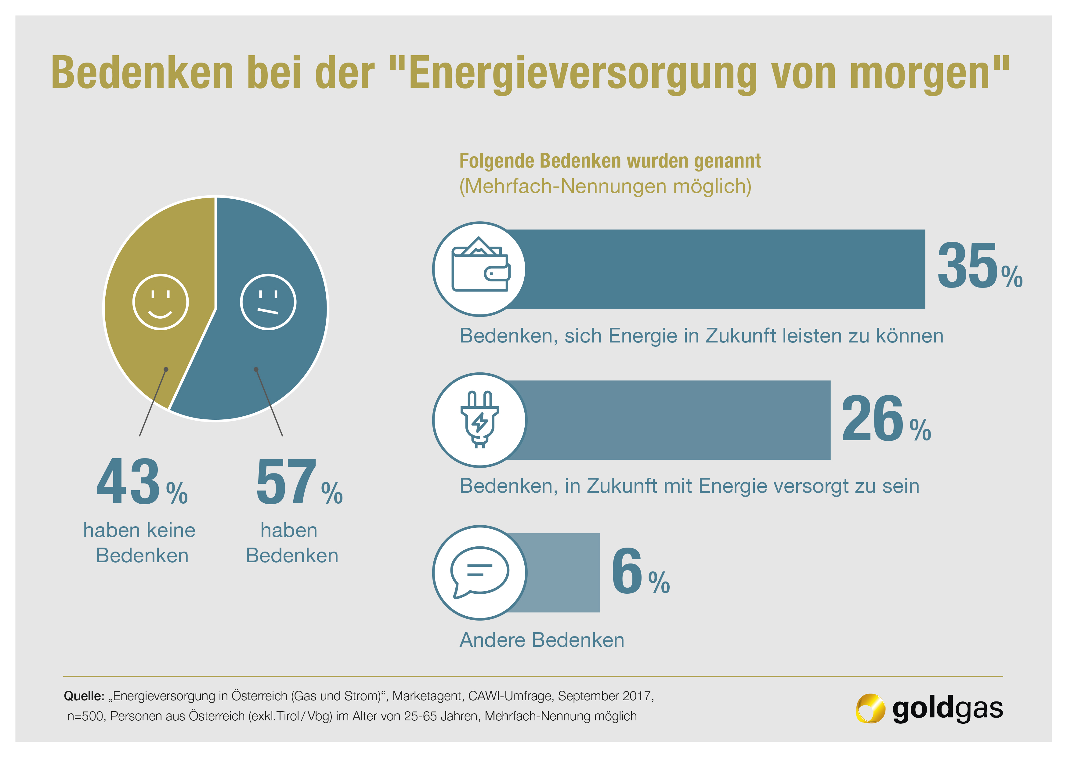 In Hinblick auf die Zukunft hat goldgas im Rahmen der Studie „Energieversorgung in Österreich (Gas und Strom)“ die Kernzielgruppe auch nach den spontanen Assoziationen zu „Grünes Gas“ und „Grüner Strom“ befragt. Die Auswertung zeigt, dass die Begriffe mit überwiegend positiven Assoziationen in Verbindung gebracht werden: Zu den häufigsten Nennungen zählen umweltfreundlich (25,4 %), Windenergie (20,0 %), Wasserkraft (20,0 %) sowie Solar- bzw. Sonnenenergie (18,6 %). Negative Assoziationen wurden deutlich seltener genannt (3,2 % gelogen/stimmt nicht; 3,0 % teuer; 3,0 % passt nicht zu Gas; 2,2 % nur ein Marketing/Werbespruch). „Die Ergebnisse zeigen, dass das Interesse der Kunden an den Themen ‚Grünes Gas‘ und ‚Grüner Strom‘ heute schon vorhanden ist. Unser gemeinsames Ziel muss es sein, in Zukunft das Bewusstsein für Biogas aus nachhaltiger Produktion und Strom aus erneuerbaren Energiequellen noch zu verstärken und in den Köpfen der Menschen zu verankern“, ist sich Energieexperte Maaß sicher.