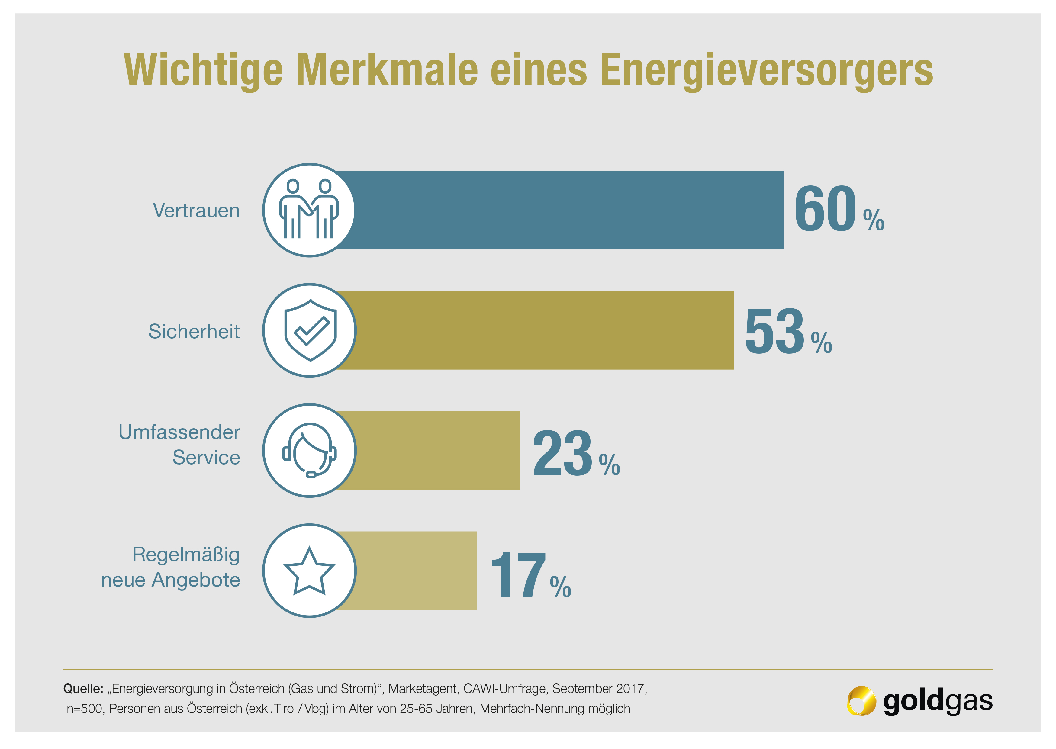 Die Ergebnisse der goldgas-Studie bestätigen das Sicherheitsbedürfnis der Konsumenten: Rund 60 Prozent der befragten Personen bewerten „Vertrauen“ in den Energieversorger als wichtigstes Merkmal, gefolgt von „Sicherheit“, die für 53 Prozent der wichtigste Faktor ist. Gefragt nach den konkreten Erwartungen an den optimalen Energieanbieter, geben jeweils drei Viertel der Personen die garantierte Versorgungssicherheit (75 %) und die transparente und verständliche Abrechnung (72,2 %) an.
