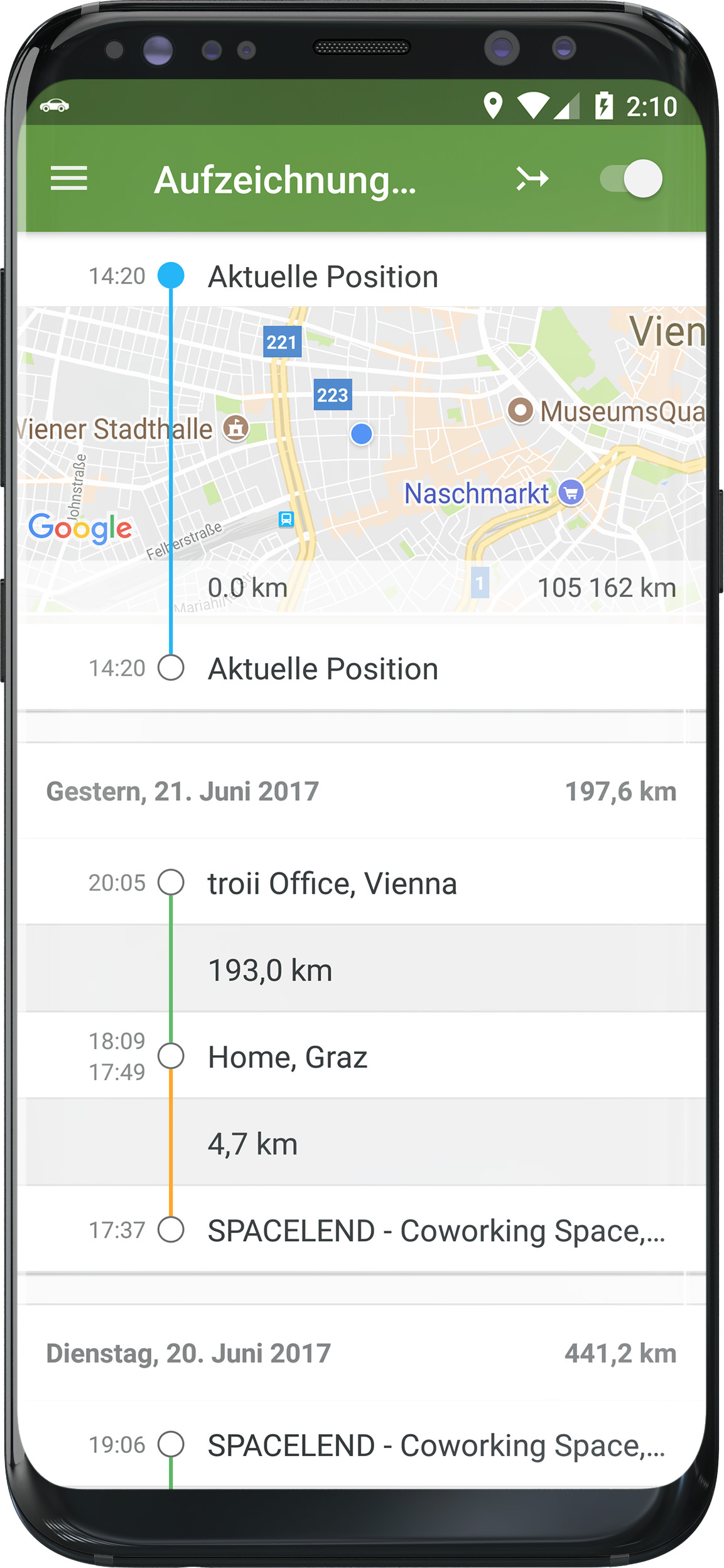 Tour ist eine automatische Fahrtenbuch App, die dem Nutzer das Führen eines Fahrtenbuchs abnimmt. Ein manuelles Erfassen von Fahrten ist nicht mehr notwendig.