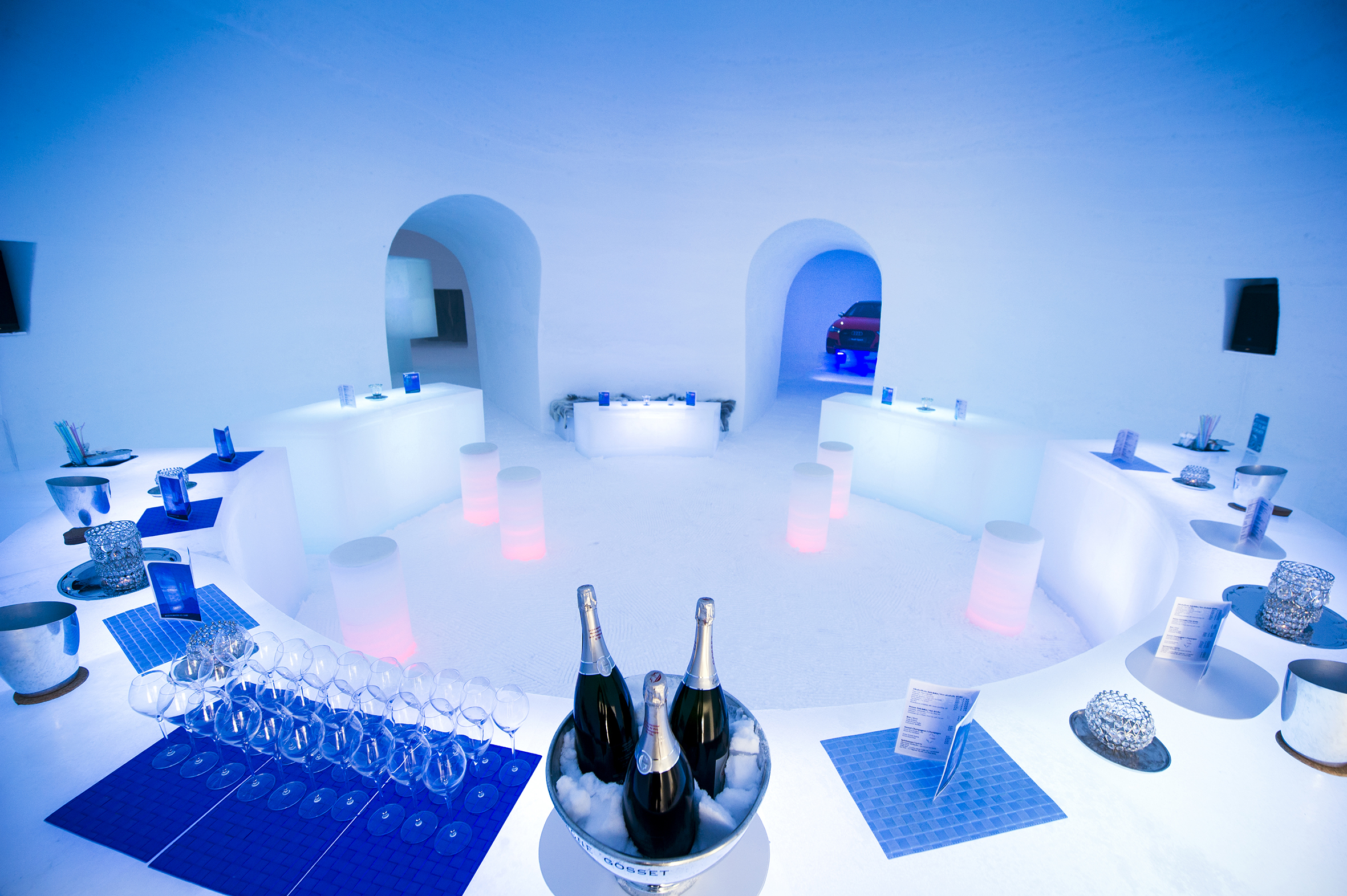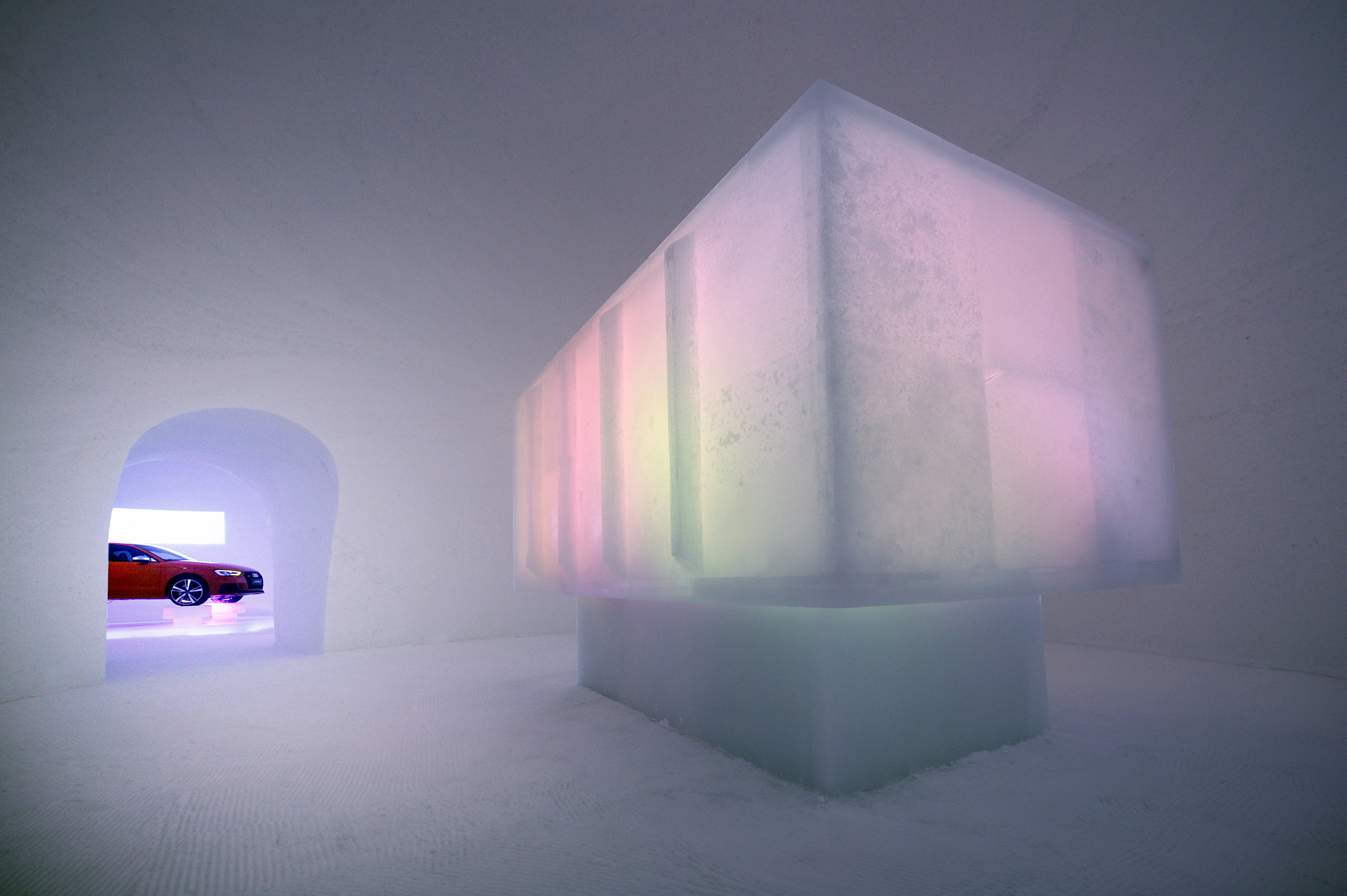 Beim Betreten des ICE CAMPS taucht man ein in fröhliches Stimmengewirr, das zusammen mit flackernden, bunten Lichtern und nach Minze duftendem Nebel aus einem großen Eiskubus strömt. „Die ,medienbox‘ belebt alle Sinne“, verrät Eiskünstler Max Seibald und fügt hinzu: „Wer in das Wirrwarr der Stimmen hineinhorcht, kann Fragmente mehrsprachiger TV-Berichte hören.“ Nach dem lebendigen Mediengeflimmer ist der „Audi Show-Room“ der ideale Ort zum stillen Bewundern der ausgefeilten Technik des Audi RS 3. Besucher haben hier die Möglichkeit, die moderne Formensprache des sportlichen Audis aus allen Perspektiven zu betrachten und am fix installierten Photopoint ein cooles Erinnerungsbild machen zu lassen.