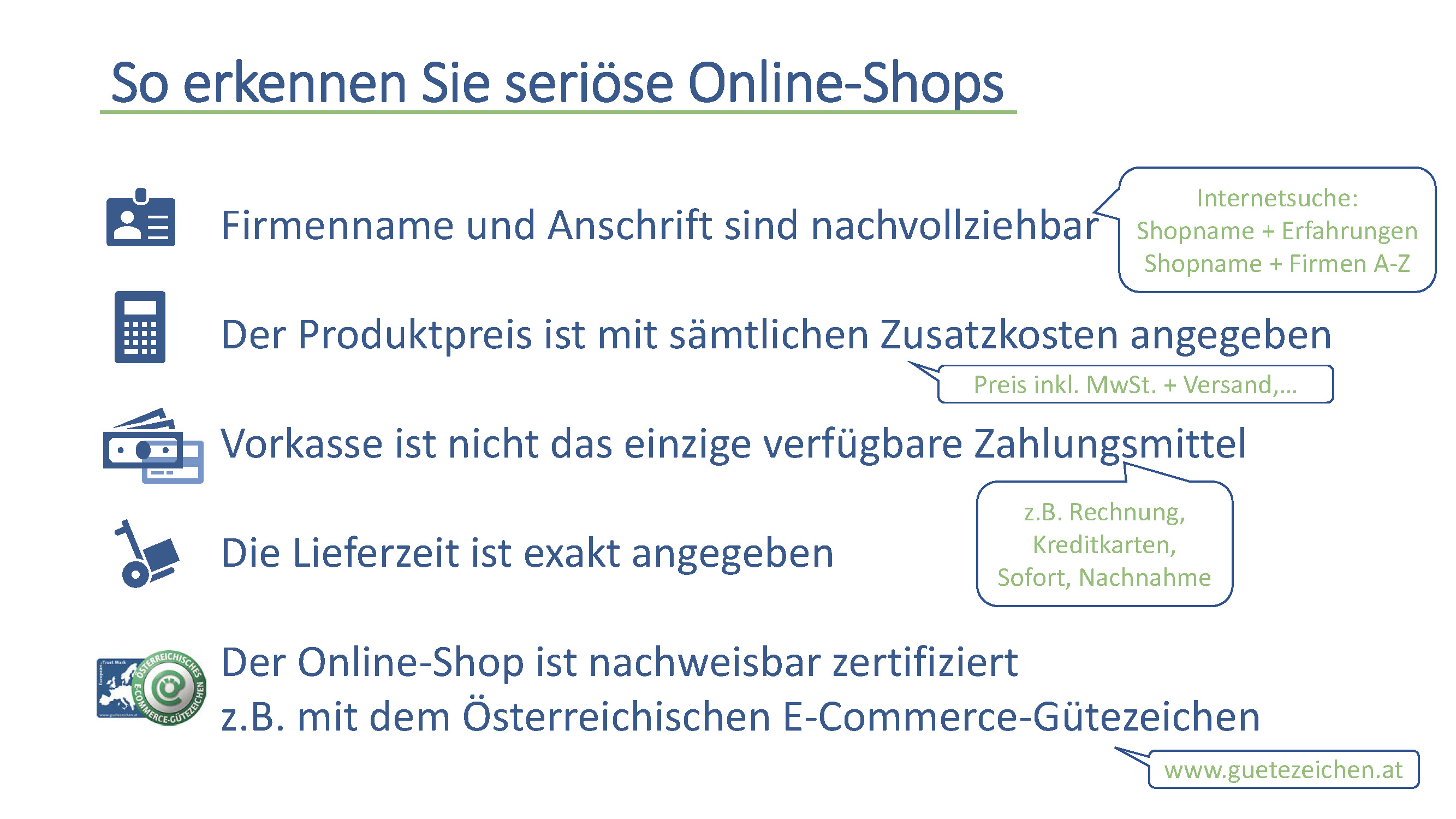 Das Österreichische E-Commerce-Gütezeichen (http://www.guetezeichen.at) ist das sichtbare Zeichen für seriösen Online-Handel. Als einziges Gütesiegel im E-Commerce wird es von Wirtschaftskammer, Arbeiterkammer und Wirtschaftsministerium unterstützt und genießt daher ein hohes Vertrauen bei Konsument/innen. Die Spezialisierung auf die rechtlichen und kulturellen Herausforderungen im österreichischen Online-Business gibt Händlern rechtliche Sicherheit im Verkauf in und nach Österreich. Gleichzeitig ist das Gütezeichen als Mitglied des European Trustmark europaweit bestens vernetzt. Durch die Zertifizierung erhalten Händler ein sichtbares Zeichen für Seriosität und darüber hinaus kostengünstige Unterstützung und Beratung für den Online-Shop.