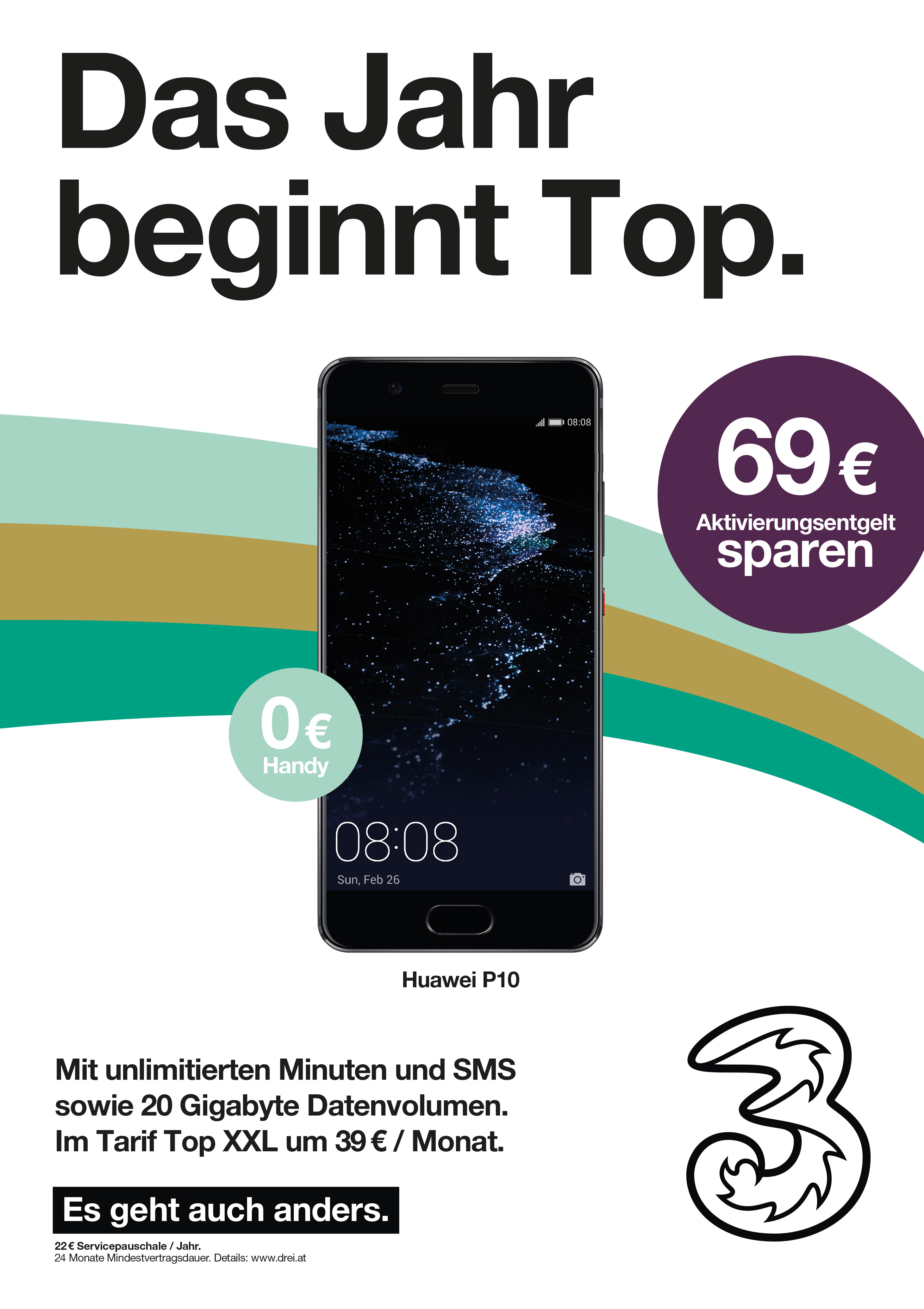 In Kombination mit den neuen Top-Tarifen sind vier ausgewählte Smartphones ab 9. Februar 2018 zum Spezialpreis erhältlich. Während das Huawei P10 lite und Samsung Galaxy J5 (2017) gemeinsam mit Top L 36€ kosten, zahlen Top XXL Kunden für das Huawei P10 0€ und für das iPhone 8 64 GB günstige 306€. Kunden, die dieses Kombiangebot nutzen, schenkt Drei das Aktivierungsentgelt in der Höhe von 69€.