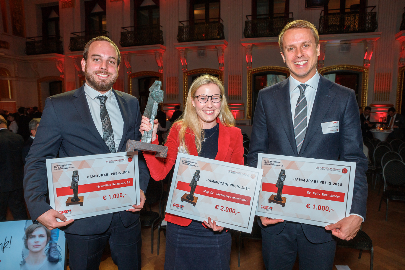 Ein besonderes Highlight war, wie jedes Jahr, die Verleihung der begehrten Auszeichnung der Branche, des Hammurabi Preises. Über die Siegerstatue aus Bronze, die von Fachgruppenobmann-Stv. Mag. Wilhelm Hemerka übergeben wurde, freute sich heuer Mag. Dr. Stefanie Gusenleitner, die für ihre Einreichung „Die vorvertragliche Anzeigepflicht des Versicherungsnehmers“ zusätzlich 2.000 Euro Preisgeld erhält. Die Einreichungen von Dr. Felix Kernbichler (Vertragsschutz in der Insolvenz) und Maximilian Feldmann, B.A. (Der Nutzen von Dienstleistungsmarketing zur Imageverbesserung von österreichischen Banken im Business-to-Customer Bereich) wurden mit je 1.000 Euro prämiert.