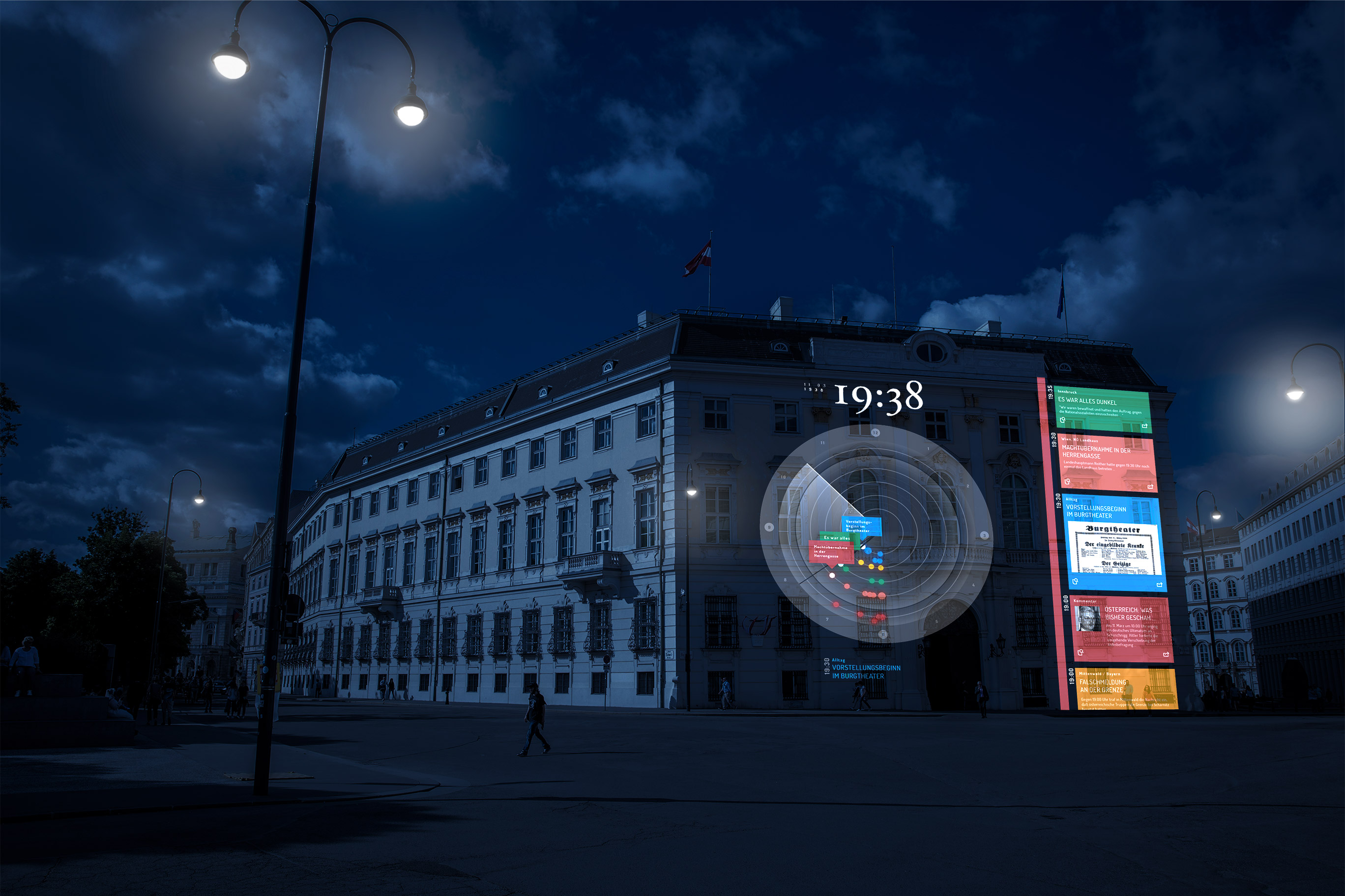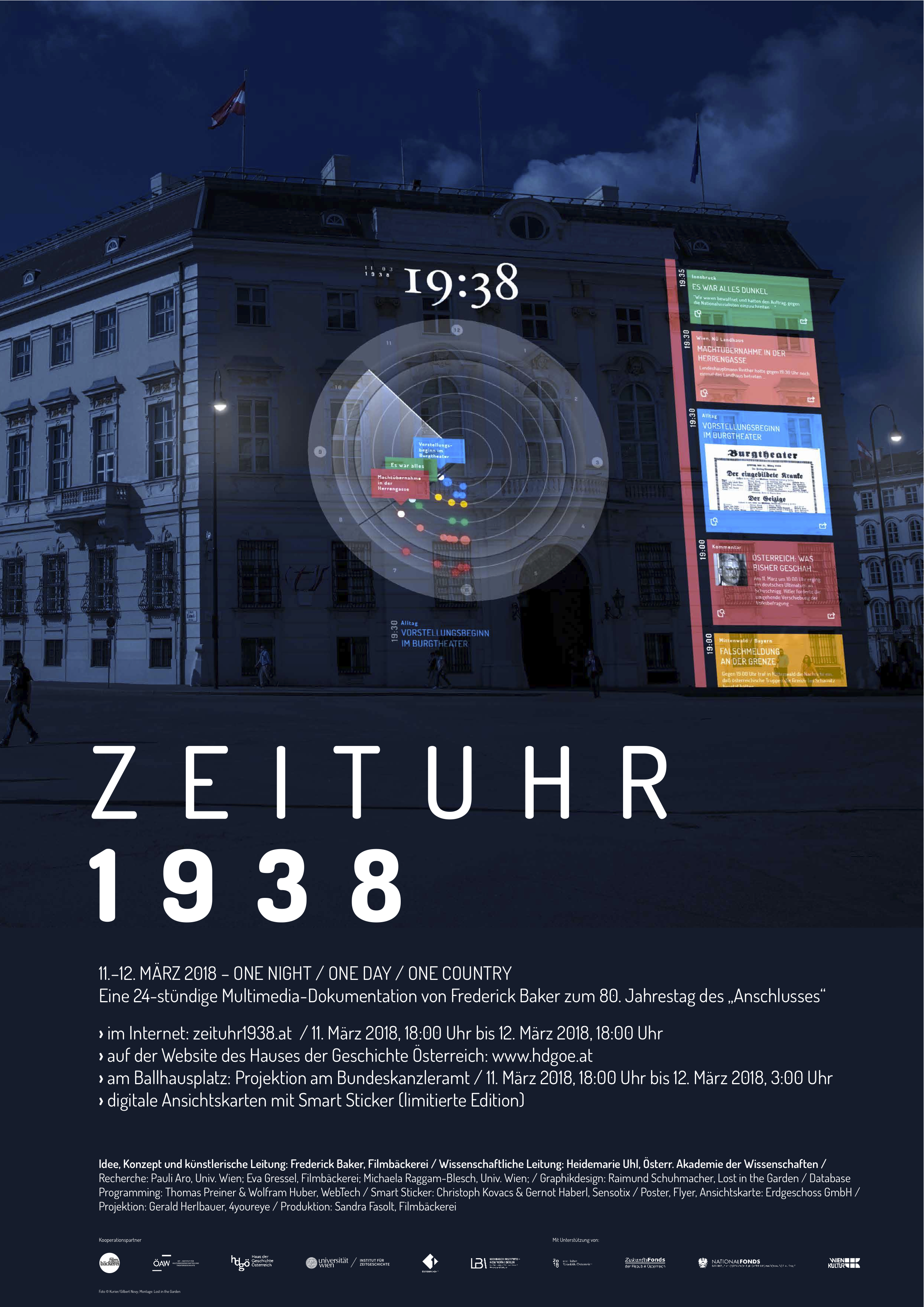 Im Gedenkjahr 2018 wird in einer groß angelegten 24-stündigen multimedialen Dokumentation die Erinnerung an die Errichtung des NS-Terrorregimes in Österreich wach gerufen. Der Filmemacher und Medienkünstler Frederick Baker stellt den „Anschluss“ genau 80 Jahre später wie eine Abfolge an Live-Ereignissen über neue Medienkanäle dar: im Internet, über digitale Ansichtskarten mit NFC-Sticker fürs Smartphone (neues Produkt eines österreichischen Start-ups) und im Rahmen einer Projektion auf die Fassade des Bundeskanzleramts.
