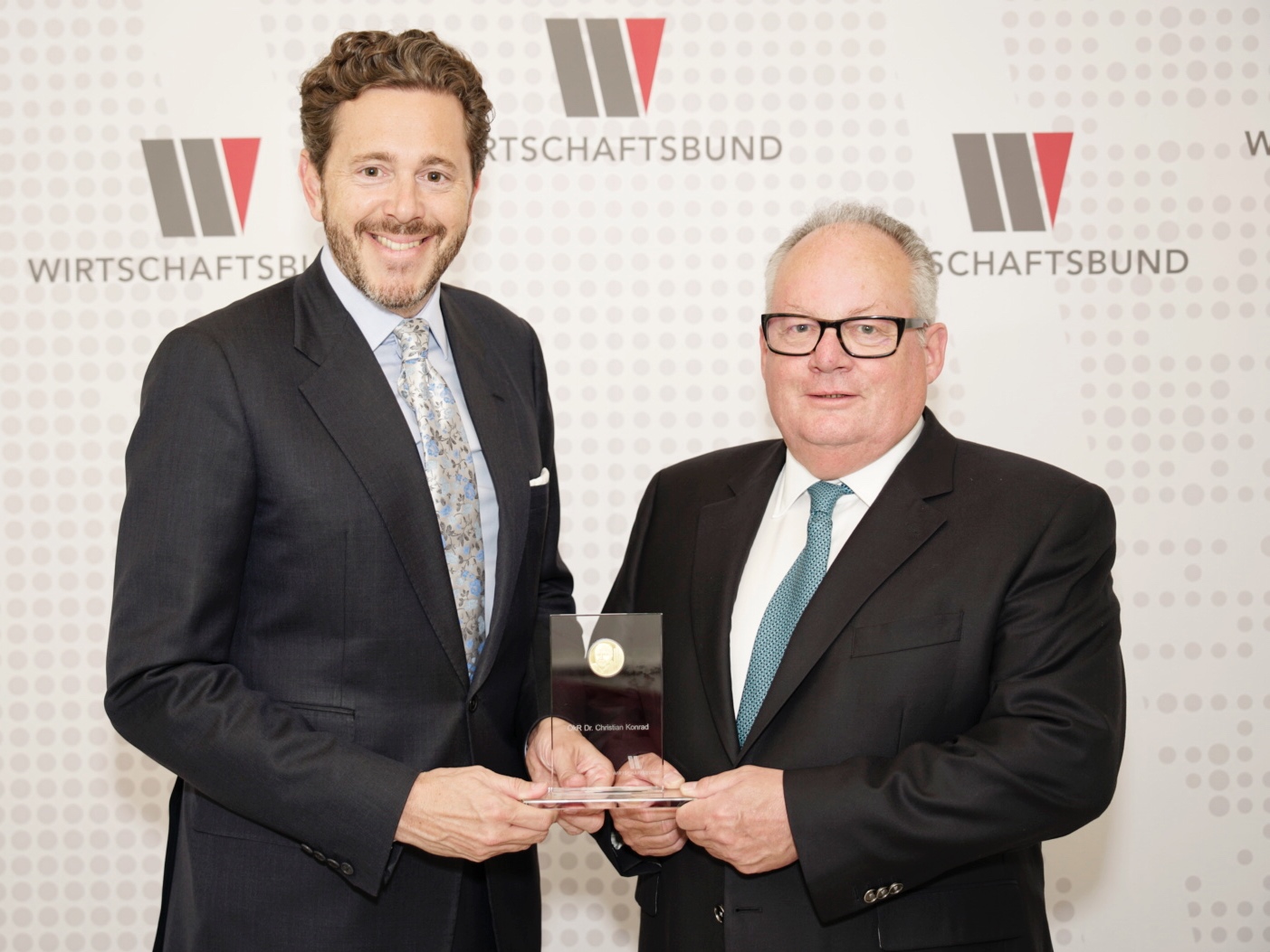 Heute zeichnete Wirtschaftsbund-Präsident Dr. Harald Mahrer den ehemaligen Raiffeisen-Generalanwalt Dr. Christian Konrad mit der goldenen Julius-Raab-Medaille aus. Mahrer erläutert die Wahl des diesjährigen Preisträgers: „Christian Konrad hat stets unternehmerische Werte wie Freiheit, Leistungs- und Eigentumsorientierung mit gesellschaftlicher Verantwortung und Solidarität bei seinem Wirken für Österreich in Einklang gebracht.“