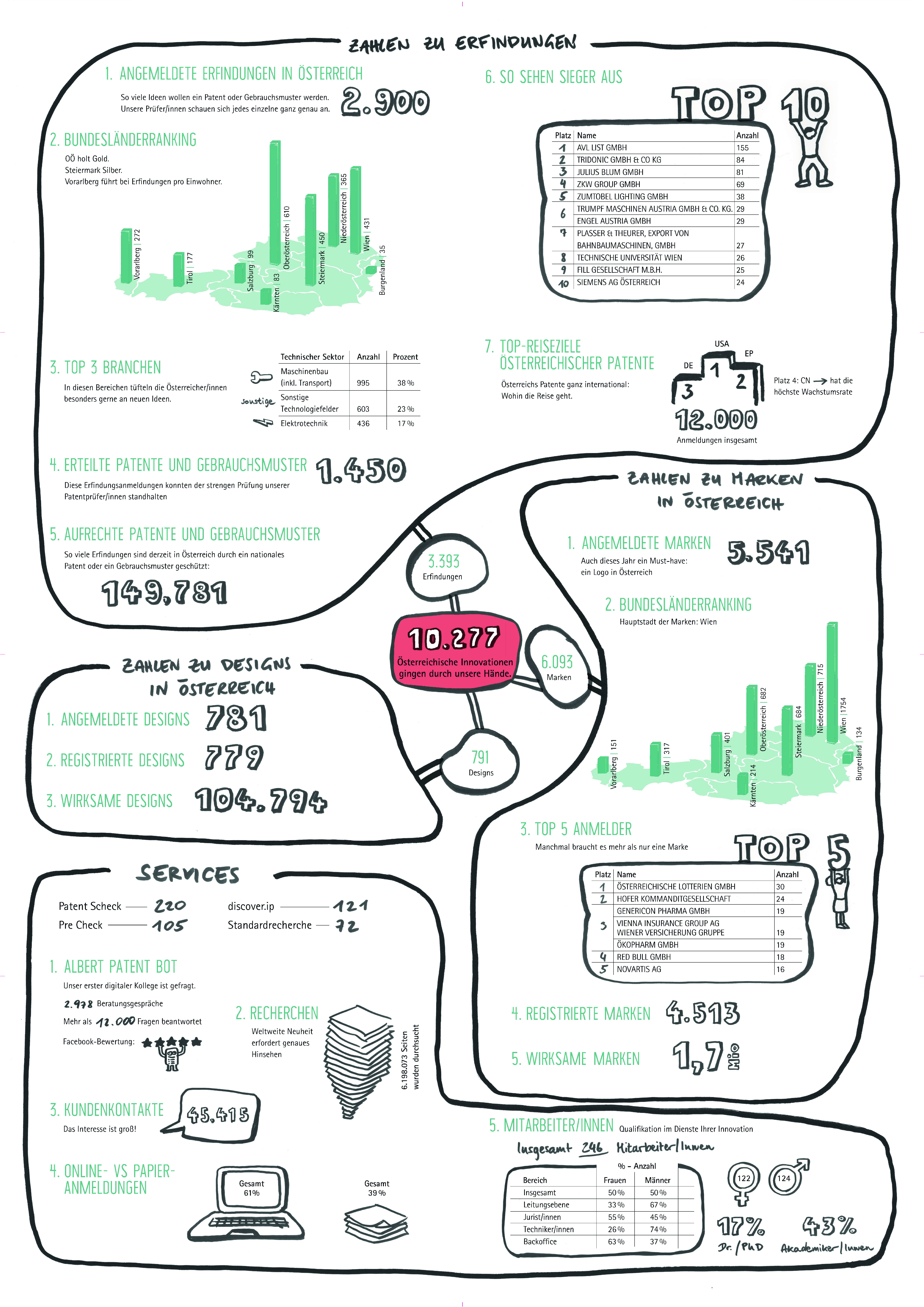 Die Top-Anmelder 2017 im Bereich Patente sind AVL List (155 Erfindungsanmeldungen), Tridonic (84) und Julius Blum (81). Bei den Marken führen die bekannten Consumer-Brands Österreichische Lotterien (30 Markenanmeldungen) und Hofer (24) das Ranking an.