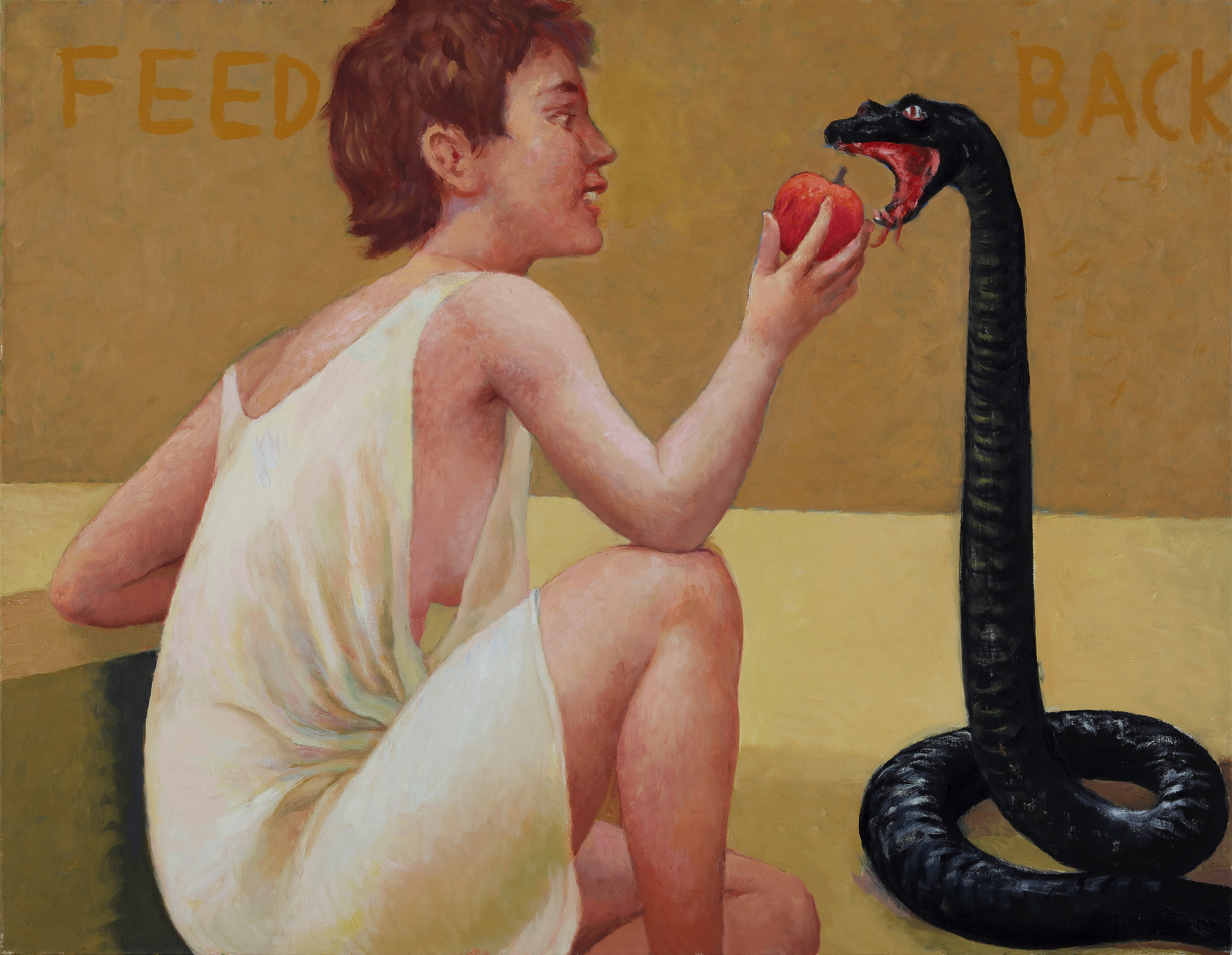 Zu den bereits in Hamburg ausgestellten Künstler/innen VALIE EXPORT, Adolf Frohner, Max Klinger und Maria Lassnig reihen sich nun unterschiedlichste Positionen, die auch mit Kategorien wie Kitsch, Pornografie, Kritik und Humor das Thema umkreisen. Erhard Stöbes Gemälde Feedback (2004) karikiert mit humorvollem Wortspiel den Eva-Mythos. Carola Dertnig setzt sich in ihrer fotografischen Arbeit Sans Titres (2009–2018) mit „Evas“ neuen Kleidern auseinander. Das Paradies und seine Gelüste haben Renate Bertlmanns Verbotene Früchte (1992) sowie die Videoperformance garden of lust (2012) von Fanni Futterknecht und Marianne Vlaschits zum Thema. Den Kitsch und das Vulgäre feiert auch Bernhard Traghuts Skulptur Die Frucht der Erkenntnis (2004).