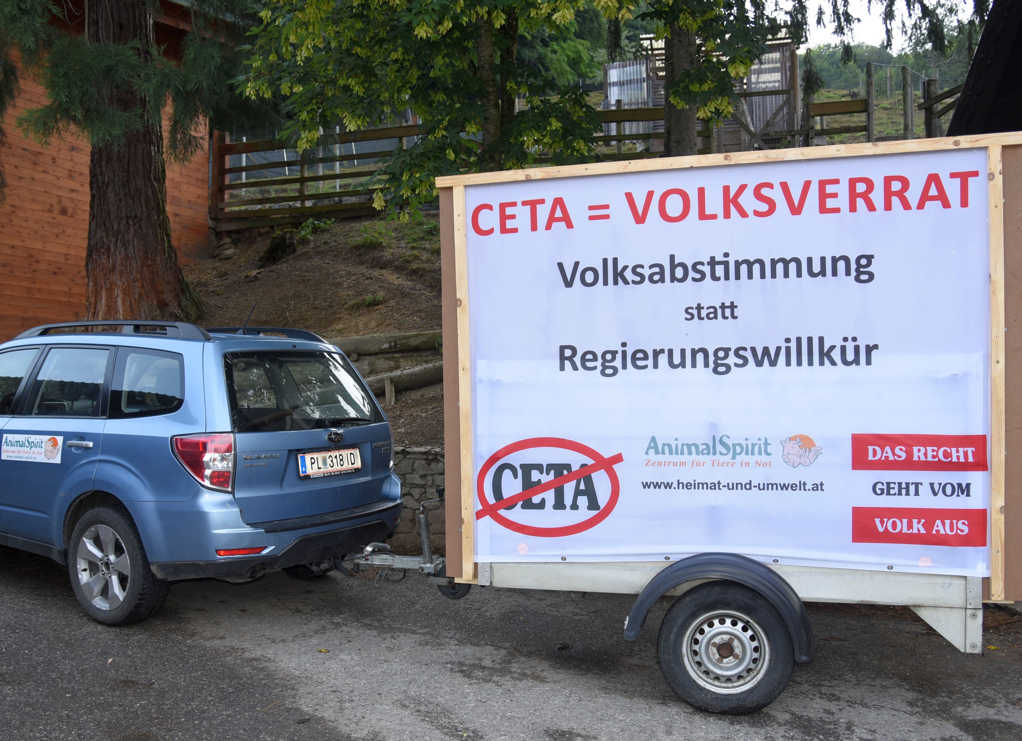 Aus diesem Anlaß – der möglichen Ratifizierung des CETA-Abkommens durch ÖVP, FPÖ und NEOS im Parlament in dieser Woche – fährt heute und morgen jeweils ein PKW mit Anhänger und zwei großen Transparenten mit der Aufschrift „CETA = VOLKSVERRAT, Volksabstimmung statt Regierungswillkür“ (siehe Bild), verstärkt durch erklärende Megaphon-Durchsagen, den ganzen Tag durch verschiedene Bezirke in Wien!