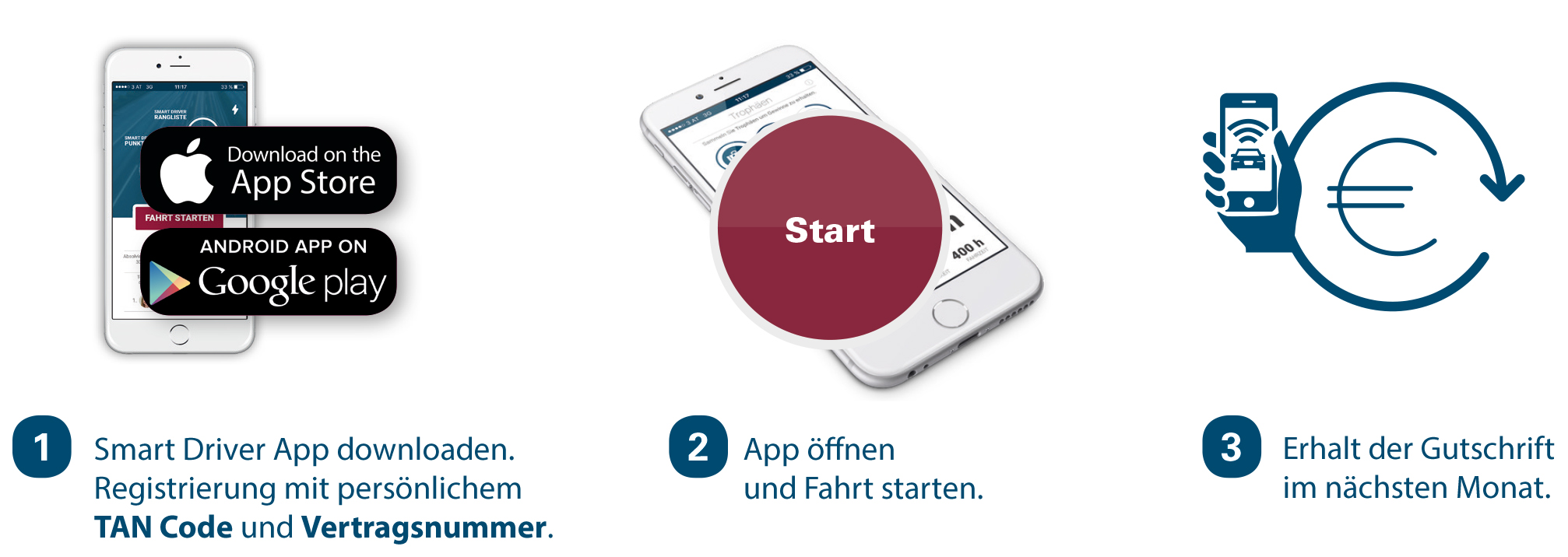 Die SMART DRIVER App öffnet den Weg zum Telematiktarif. Während der Fahrt werden via GPS und Sensoren im Mobiltelefon Beschleunigung, Brems- und Kurvenverhalten sowie Geschwindigkeit gemessen. Daran lässt sich erkennen, wie rücksichtsvoll und sicher jemand fährt. Zusätzlich werden Straßenart und Tageszeit berücksichtigt. Die Kombination dieser Parameter ergibt die Punkteanzahl für das Fahrverhalten. Nach jeder Fahrt erhalten SMART DRIVER eine detaillierte Auswertung der absolvierten Streckenabschnitte. So können Fahrerinnen und Fahrer das eigene Potential zur schrittweisen Verbesserung der Fahrweise sofort erkennen.