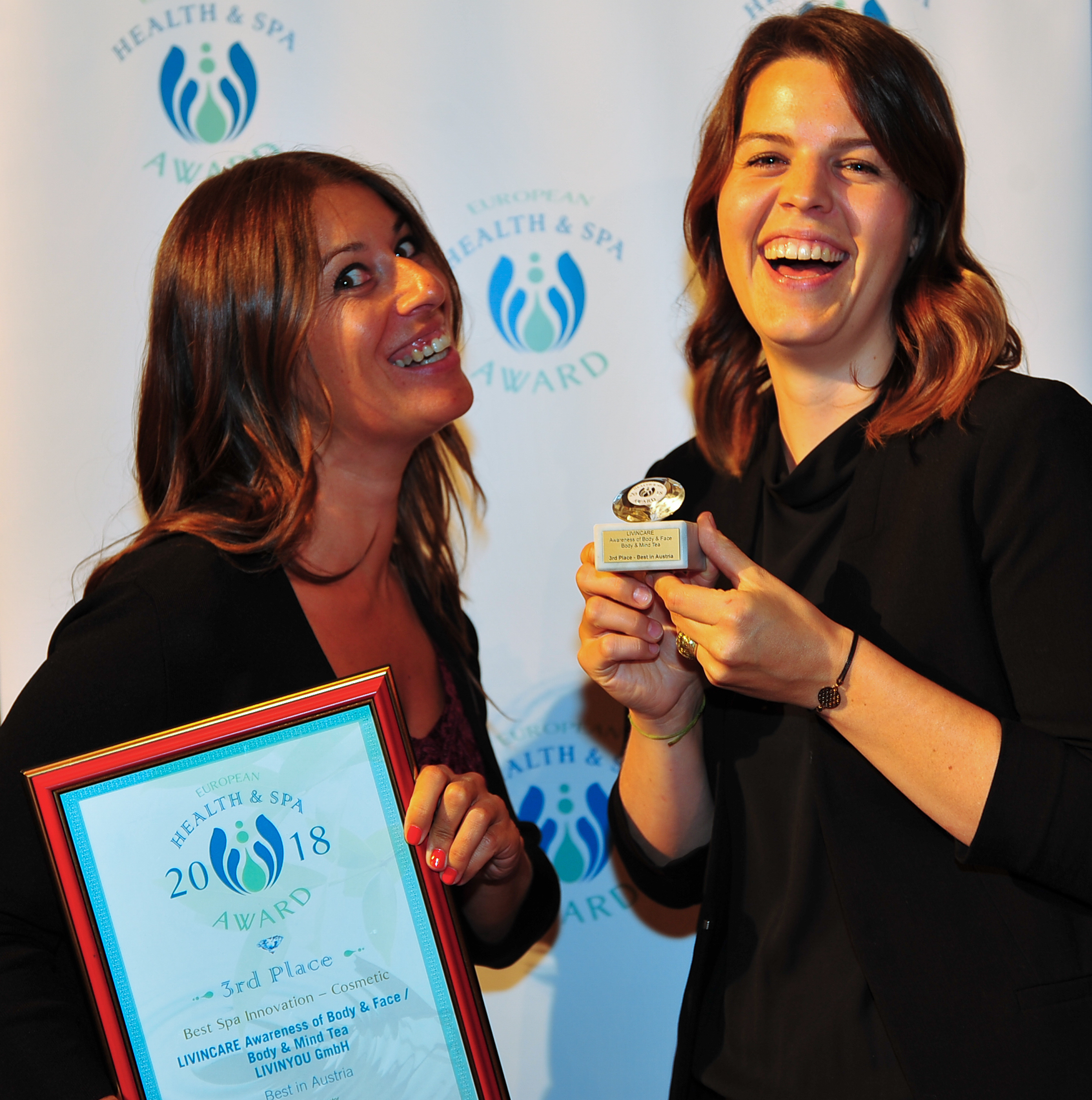 „Der Preis für die LIVINCARE Tee-Kollektion bestätigt unseren seit Jahren eingeschlagenen Weg der Entwicklung von Innovationen für den SPA Bereich. Die LIVINCARE Tee-Kollektion bestehend aus 8 Teemischungen mit ausgewählten Kräutern fördert die Entschlackung, regt die Harmonisierung an und erhöht die Lebensqualität“, freuen sich Sandra Agerer und ihrer Geschäftspartnerin Andrea Pichler von LIVINYOU über die international renommierte Auszeichnung. Bei der Preisübergabe auf der Gala des European Health & Spa Award im Wiener Park Hyatt Hotel stand der Genuss der qualitativ hochwertigen Tee-Mischungen im Rahmen von innovativen Behandlungen im Vordergrund.