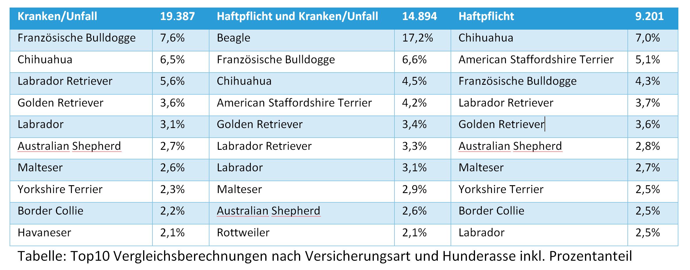 In der Analyse wurden 64.027 Online-Versicherungsvergleiche im Zeitraum von 1.7.2017 bis 30.6.2018 berücksichtigt, bei 43.482 wurden die Hunde als „reinrassig“ angegeben. Davon wiederum wurden 19.387 Vergleiche für eine reine Kranken-/Unfallversicherung berechnet, 14.894 für eine kombinierte Haftpflicht- und Kranken-/Unfallversicherung und 9.201 für eine reine Haftpflichtversicherung.