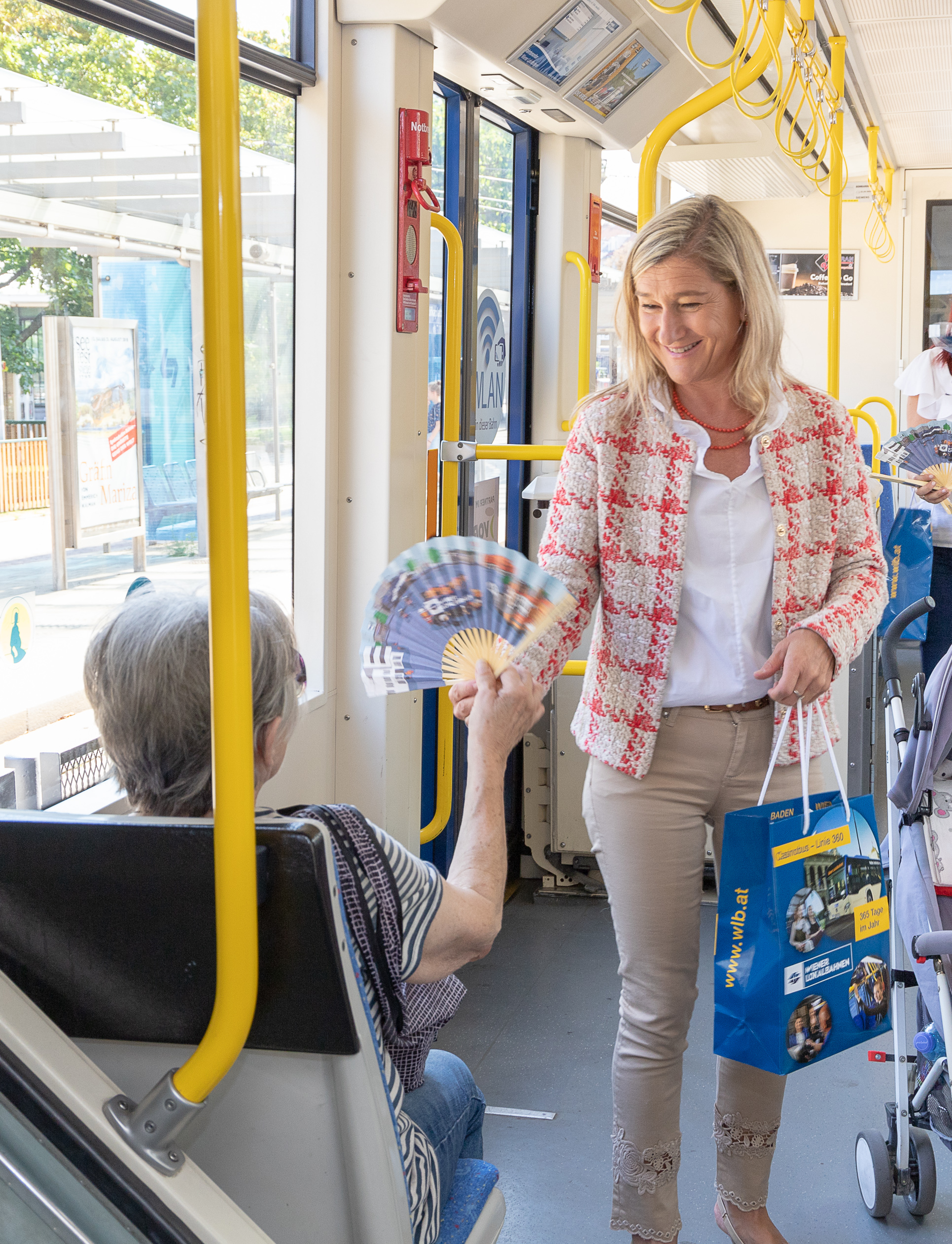 Rechtzeitig zu Beginn der neuen Hitzewelle unternimmt die Badner Bahn eine Service-Offensive für ihre Fahrgäste: Wiener Lokalbahnen Geschäftsführerin Monika Unterholzner und ihr Team verteilen in der Bahn Fächer gegen die Hitze. „Es ist eine Geste der Achtsamkeit. Wir haben großes Verständnis für unsere Fahrgäste, die im Sommer unter der Hitze leiden“
