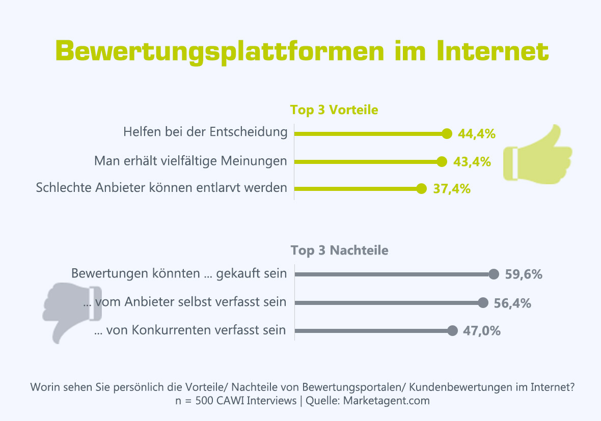 , fasst Thomas Schwabl, Geschäftsführer von Marketagent.com die wesentlichen Vorteile für die Österreicher zusammen. Aber auch das Entlarven von „Schwarzen Schafen“ (37,4%), die Möglichkeit echte Erfahrungswerte von Kunden zu erhalten und das Produkt bzw. den Anbieter besser einschätzen zu können, wird Bewertungsportalen positiv zugeschrieben, um vor bösen Überraschungen gefeit zu sein (jeweils 34,8%). Doch wo Licht ist, da ist auch Schatten und so kann sich jeder Zehnte nur wenig für die Entscheidungshilfen aus dem Internet begeistern. „Die Bewertungen könnten gekauft oder vom Anbieter selbst verfasst sein“ geben knapp 6 von 10 zu bedenken. Viele stoßen sich auch daran, dass Konkurrenten oder Neider für die Beiträge verantwortlich sein könnten (47,0%) und dass Produkte oder Anbieter aufgrund von Kundenevaluierungen schlichtweg vorbeeinflusst beurteilt werden.