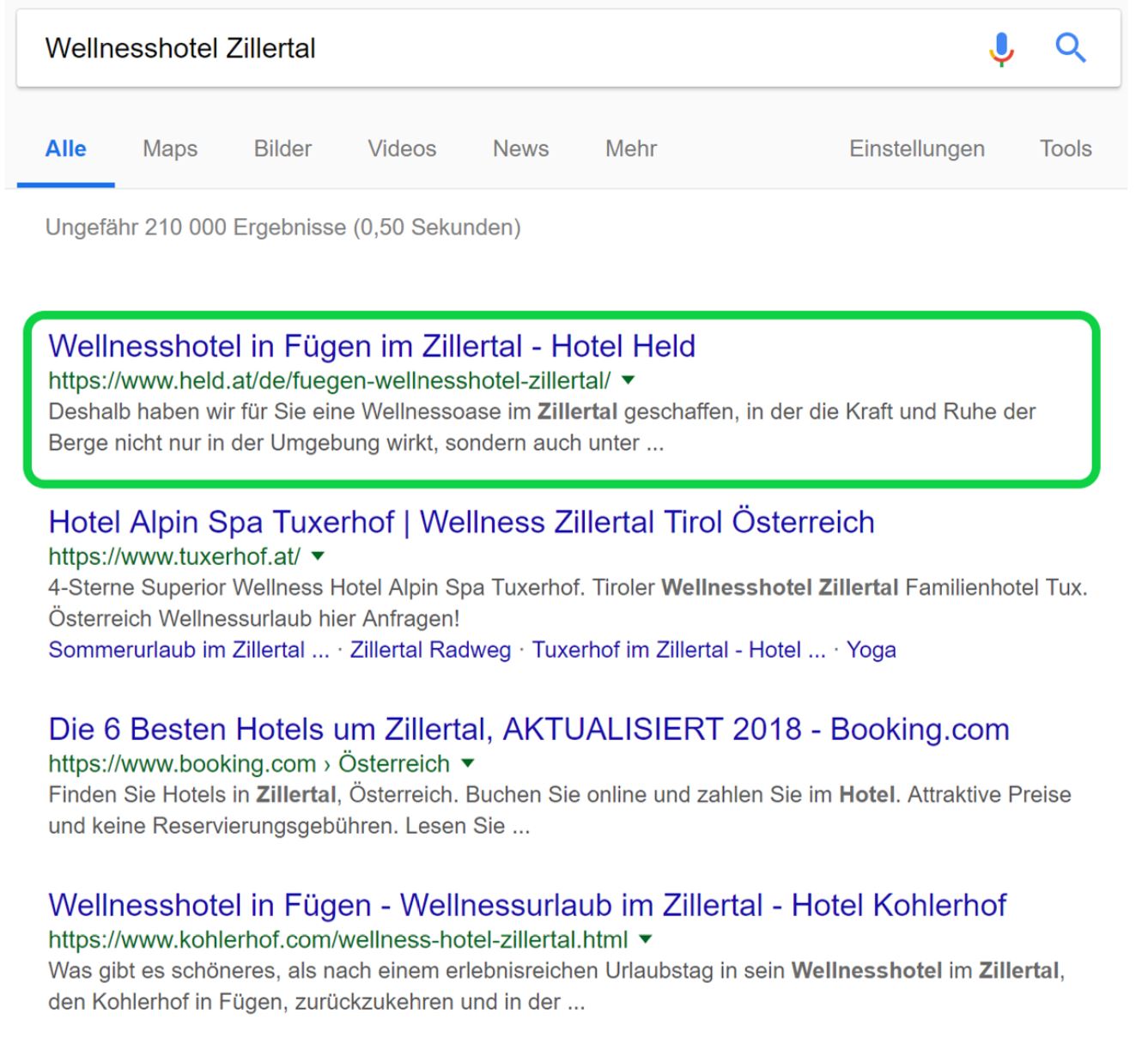 Bei der Erstanalyse des Hotels Held wurde festgestellt, dass die Konkurrenz für Wellnesshotel Zillertal sehr hoch ist, aber auf Grund des enormen Suchvolumens und Relevanz des Hotels die aktuelle Position von 8-12 (schwankend zwischen Google-Seite 1 ganz unten oder Google-Seite 2 weiter oben) dieses Keyword sehr erfolgsversprechend ist.