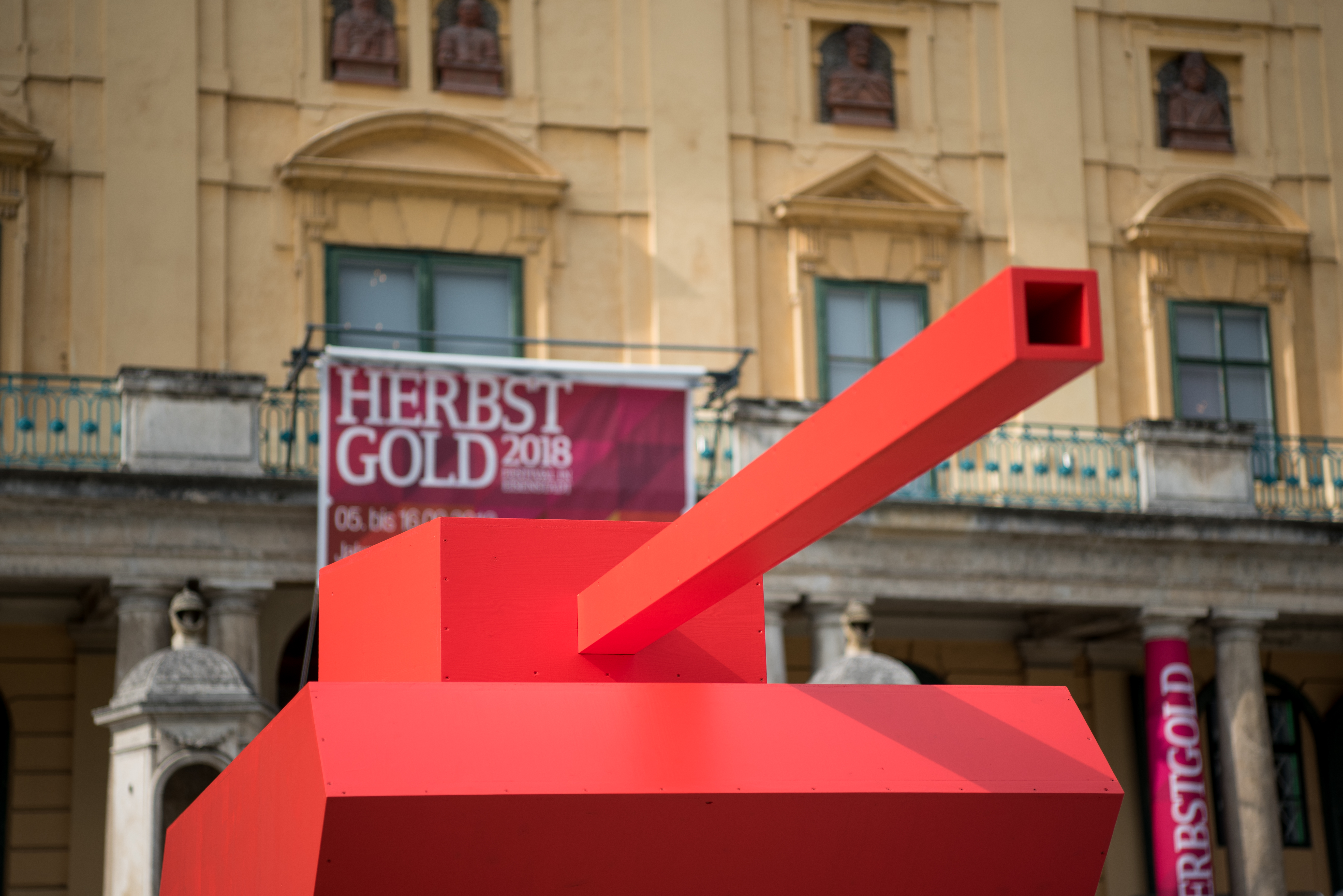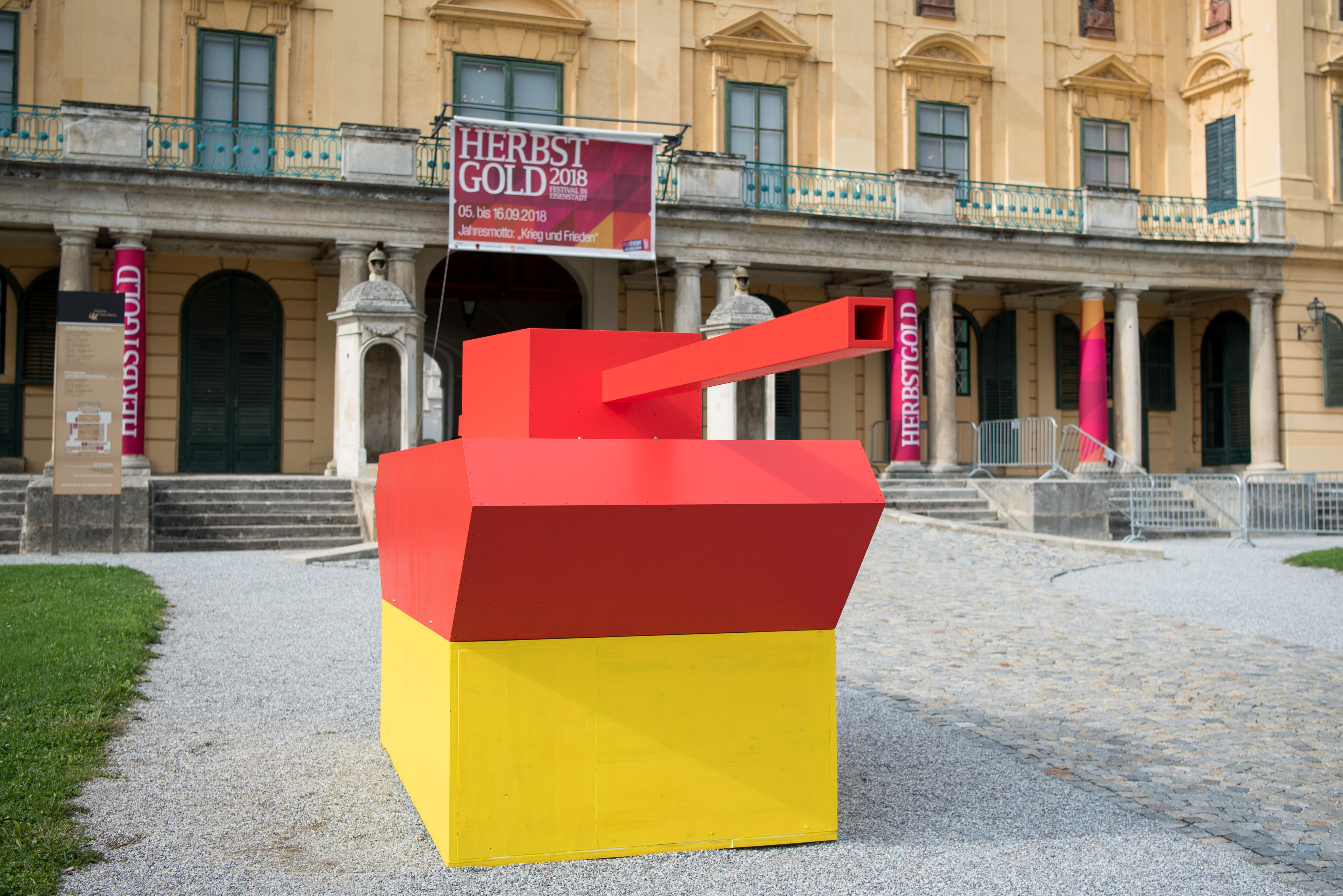 Die Begriffe „Krieg“ und „Frieden“ sind nur scheinbar klare Gegensätze. Meist bezeichnen die Wörter Situationen, die eher Übergangsformen und Schräglagen darstellen. Im Festivaltitel „Krieg und Frieden“ zeigt sich dieser gemischte Zustand im kleinen Wörtchen „UND“. Eine Konjunktion wie „ODER“ wäre eine direkte Opposition, aber so ist das bei „Krieg und Frieden“ eben nicht. Krieg UND Frieden sind immer beides: Ruhe und Sturm zugleich. Die Kombination entspricht zudem den unterschiedlichen Sichtweisen: Für die einen ist eine Situation subjektiv ein Frieden, für die anderen ein Kalter Krieg. „Kriege“, die beispielsweise im Privatleben schwelen oder toben, werden oft gar nicht wahrgenommen, geschweige denn erklärt. Ebenso gibt es Friedensphasen, die erst im nachfolgenden Krieg als solche erkannt werden. Diese Ambivalenz, das Sowohl-als-auch, motiviert auch die skulpturale Installation, die der Schweizer Künstler Marcus Geiger für das HERBSTGOLD entwickelt hat. Seine buchstäblich doppeldeutige Setzung besteht aus zwei Teilen: aus einem Doppelrohr-Panzer vor dem Schloss Esterhazy sowie aus vier schräg stehenden Tischen im Innenhof des Schlosses. Die Wörter, die einzeln und groß auf den Tischen stehen, geben dem gesamten Werkkomplex seinen Titel: „JA NEIN JA NEIN“. Nun ist ein Doppelrohr-Panzer, also ein Panzer, dessen Kanonenrohr sich in zwei entgegengesetzte Richtungen öffnet, wehrtechnisch ein Witz und Eigentor: Jeder Schuss nach vorne ist zugleich ein Schuss nach hinten. Aber vielleicht trifft solch ein Schuss dann ohnehin wahrhaftiger, nämlich Freund und Feind zugleich. Dass der Panzer modellhaft gemeint ist, zeigt schon seine Größe: er ist weit kleiner als ein realer Panzer und er ist auch nicht aus Metall, sondern aus lackiertem Holz gefertigt. Dass er so fröhlich rot ist und auf einem gelben Sockel thront, rückt ihn zudem in Richtung Kinderspielplatz. Die vier Tische im Innenhof des Schlosses wiederum erinnern an Verhandlungstische. Dass ihre Platten allesamt schräg stehen, macht sie jedoch dubios. Wer ist hier warum im Vor- oder Nachteil der Höhe? Dass sie alle kreischend bunt sind, macht sie zusätzlich verführerisch. Vor 370 Jahren waren Verhandlungstische noch etwas Neuartiges: Der 1648 abgeschlossene Westfälische Friede gilt als erste diplomatische Verhandlung, die einen Krieg, es war der Dreißigjährige, tatsachlich beenden konnte. Welcher Krieg UND Frieden heute im Innenhof des Schlosses verhandelt werden soll und kann, muss das Festival-Publikum selbst entscheiden. Klar ist: Es wird immer aus einer Schräglage heraus geschehen.