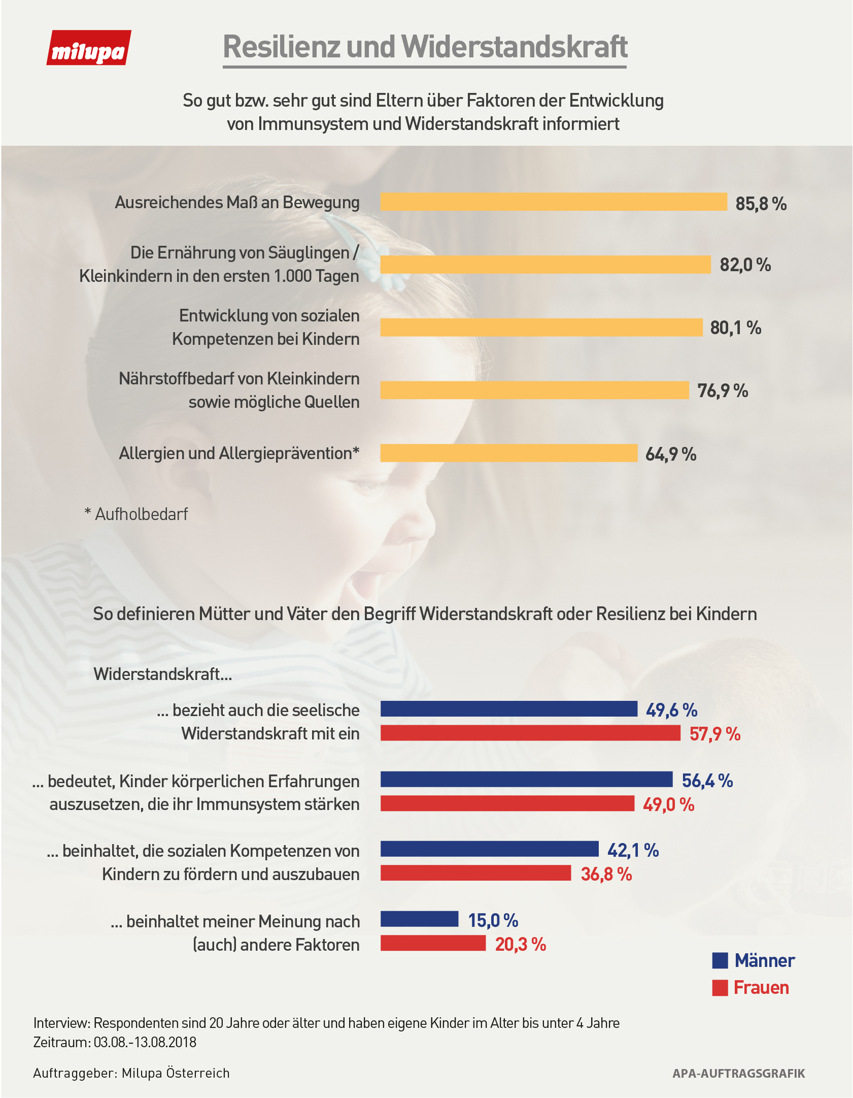 Milupa Österreich hat mit der zweiten Familienweltenstudie im Sommer 2018 wieder einen Blick in Österreichs Familienalltag geworfen. Über 500 Mütter und Väter von Kindern im Alter von 0 bis unter 4 Jahren gaben Auskunft über ihre aktuelle Familiensituation, Herausforderungen und Wissenstand zu verschiedenen Themen rund um die Entwicklung ihrer Kleinen in den ersten 1.000 Tagen. Im Fokus der Studie stand heuer das Thema Resilienz und Widerstandskraft bei Kindern. Das Resultat: Eltern bilden ein gutes Team und zeigen großes Engagement für das Wohl der Familie, der Wissensstand zu Resilienz und Immunsystem ist hoch. Woran es mangelt ist Zeit für sich und den Partner oder die Partnerin sowie Wissen rund um das Thema Allergien.