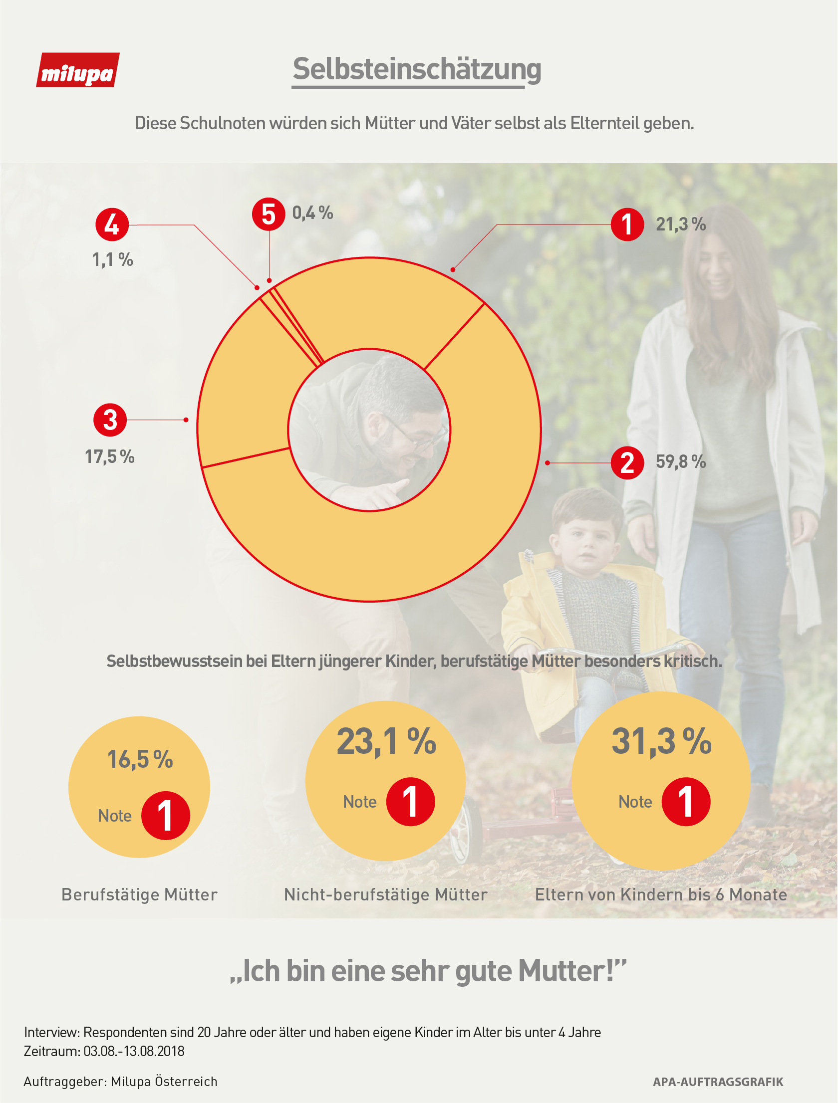 Milupa Österreich hat Mütter und Väter erneut gebeten, sich selbst eine Schulnote zu geben. Während sich 2017 noch über 80 Prozent sehr selbstkritisch mit einem „Gut“ oder „Befriedigend“ bewerteten, waren es heuer etwas mehr als drei Viertel (77%). Dennoch gab sich 2018 – wie auch im Vorjahr – gerade mal ein Fünftel der Eltern die Bestnote „Sehr gut“