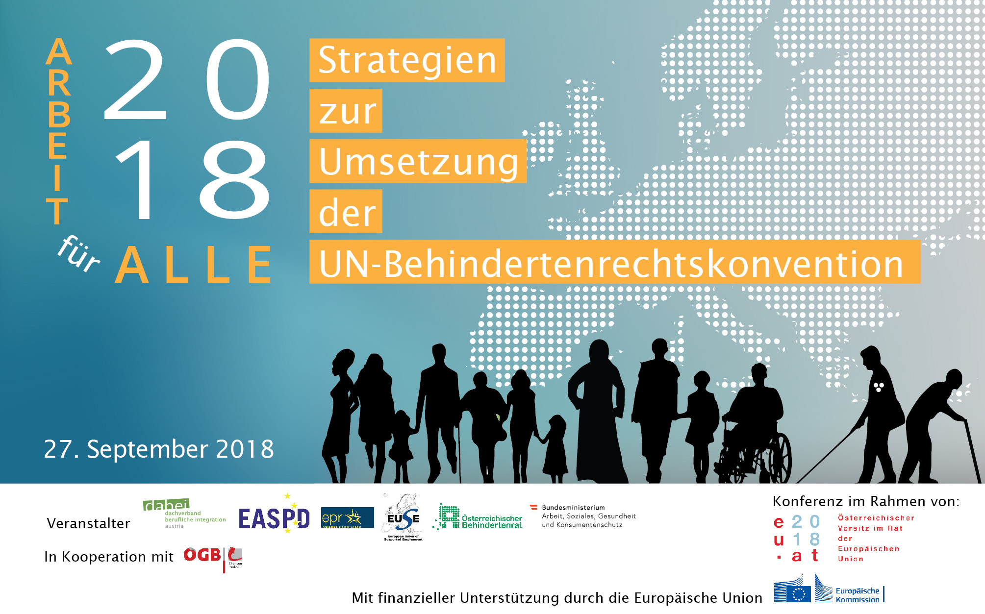 Seit 10 Jahren ist nunmehr die UN-Behindertenrechtskonvention in Österreich in Kraft. Dies wurde zum Anlass genommen, das Recht auf Arbeit für Menschen mit Behinderungen laut Artikel 27 der Konvention in den Fokus zu nehmen und eine Zusammenkunft von Expertinnen und Experten aus ganz Europa zu organisieren. Die Konferenz „Arbeit für Alle – Employment for All“ wurde veranstaltet von: Dachverband berufliche Integration Austria - dabei-austria, Österreichischer Behindertenrat, ÖGB Chancen Nutzen Büro, Bundesministerium für Arbeit, Soziales, Gesundheit und Konsumentenschutz, European Association of Service Providers for Persons with Disabilities, European Platform for Rehabilitation, European Union of Supported Employment. Am 27.09.2018 tauschten sich mehr als 250 Teilnehmerinnen und Teilnehmer aus.