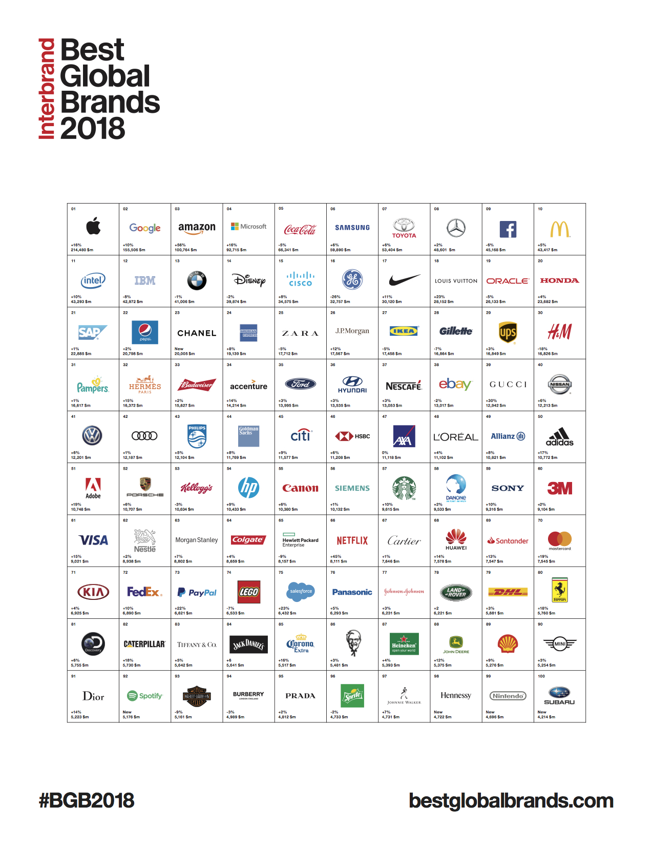 Im Jahr 2018 debütieren zwei Marken: Spotify steigt mit einem Markenwert von 5,18 Milliarden US-Dollar auf Platz 92 ein. Und auch Subaru schafft mit einem Markenwert von 4,21 Milliarden US-Dollar den Sprung unter die Top 100 (Rang 100).
