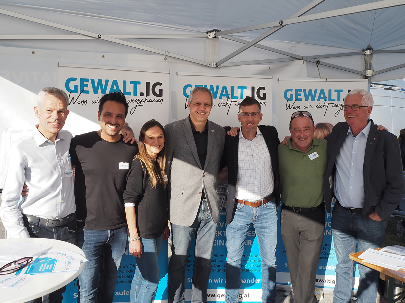 Beim ersten öffentlichen Auftritt im Zuge vom Flughafenfest fand Gewalt.ig nicht nur bei den vielen Besuchern hohen Anklang, sondern auch bei Militärkommandanten von Tirol GenMajMag.Herbert Bauer, Landespolizei Dir. Stv. Mag. Dr Edelbert Kohler, stützpunktleitende Notärztin Dr. Ursula Waibl, Leiter MCI Dep.& Studiengänge Non Profit- Sozial- & Gesundheitsmgt. FH-Prof. Dr. Siegfried Walch, Sicherheitsverantw. der Stadt Ibk Elmar Rizzoli, Obmann der Freiw. Rettung Ibk Mag. Rupert Stöckl, MSc Bundesliga Chef Gerhard Stocker und General Manager Wacker Innsbruck Alfred „Ali“ Hörtnagl.