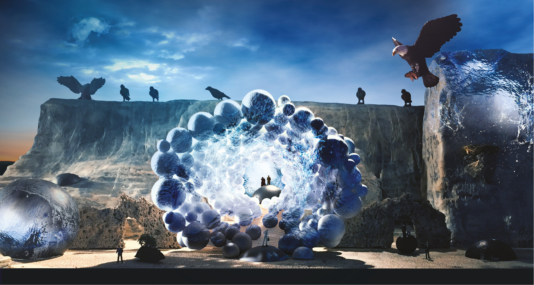 Die ebenfalls von der Entstehungszeit der Oper inspirierten, äußerst fantasievollen und farbprächtigen Kostüme wird der italienische Star-Kostümbildner Gianluca Falaschi kreieren, der mit seinen überbordenden Arbeiten immer wieder mit den höchsten Preisen der Theaterwelt ausgezeichnet wird. In bisher ungekannter Weise bezieht das Bühnenbild von Raimund Bauer die gewachsene Landschaft des Steinbruchs in den Entwurf mit ein, vereint also Natürliches und vom Menschen Geschaffenes.