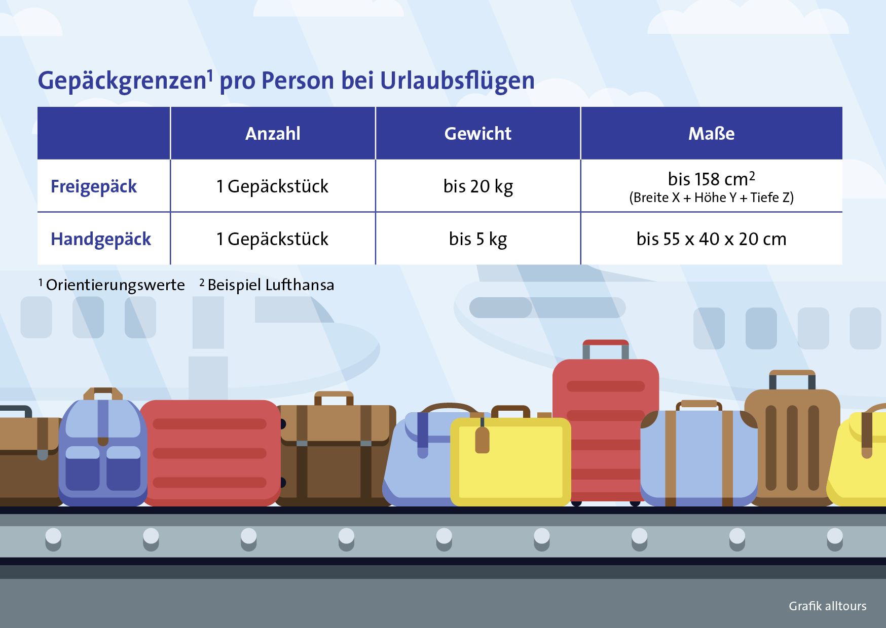 Die wichtigsten Gepäckbestimmungen und Beförderungsbedingungen der Fluggesellschaften gibt es unter www.alltours.de im Bereich "Service & Hilfe". Um ganz sicher zu gehen, empfiehlt der Reiseveranstalter alltours seinen Gästen und insbesondere Frühbuchern, die Gepäckbestimmungen vor Abflug erneut bei der jeweiligen Fluggesellschaft zu prüfen.