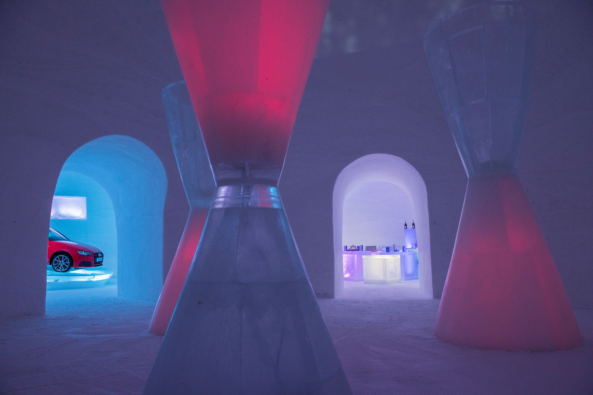 Das motorisierte Zeitalter ist im Anthropozän eine relativ kleine Zeitspanne. Umso faszinierender, welch hochtechnische Meisterleistung der feuerrote Audi S4 Avant quattro im „Audi Showroom“ zeigt. Mit seinem neu entwickelten Turbo V6 Motor bringt der Audi S4 Avant quattro mit „virtual cockpit“ und Tiptronic 8-Gang-Getriebe 354 PS auf die Straße. Hier im dritten Iglu des ICE CAMP kann man die ausgefeilte Technik dieses sportlichen und effizienten Audis, perfekt präsentiert auf einem bunt beleuchteten Eis-Teller, in Ruhe bestaunen. Über den fix installierten Photopoint setzt man sich mit dem Audi perfekt in Szene und lädt das Selfie gleich in seine sozialen Netzwerke hoch.