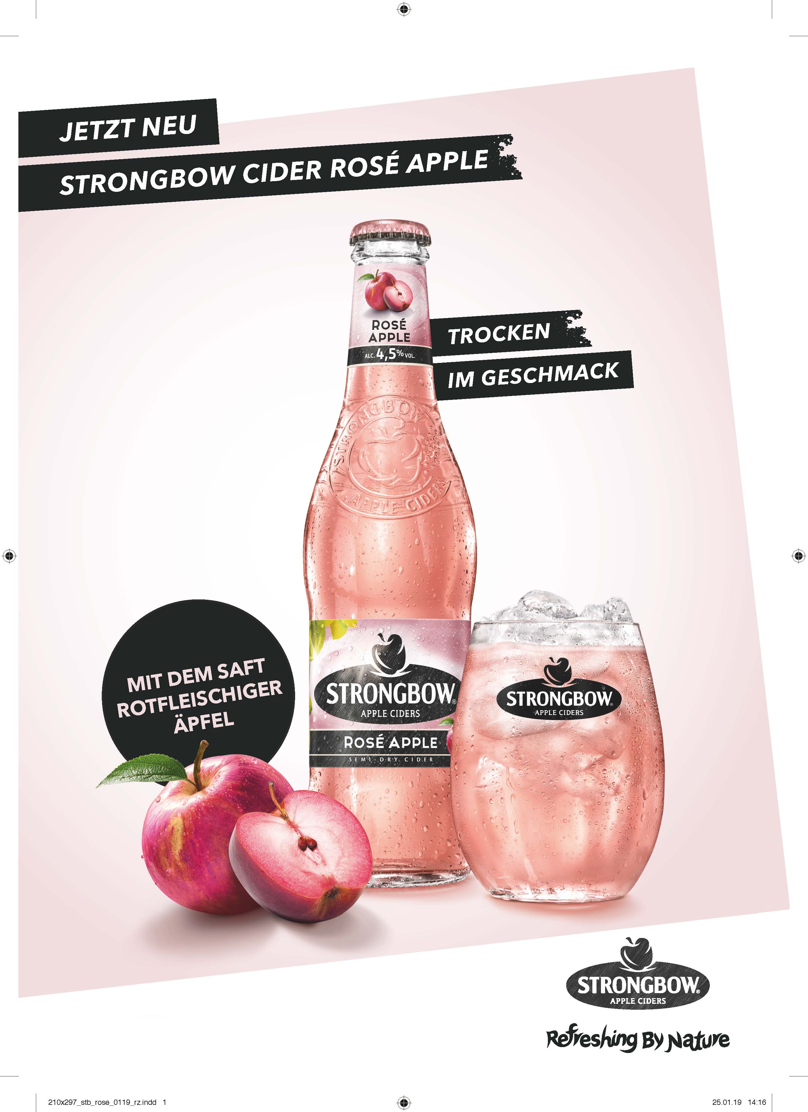 Die englische Cidermarke Strongbow wurde 1962 gegründet, ist mittlerweile in über 55 Ländern erhältlich und weltweite Nummer 1 bei Apfelcidern. Die Brau Union Österreich vertreibt neben Rosé Apple noch drei weitere Strongbow-Sorten: Gold Apple verspricht saftigen Apfelgeschmack, die intensiv rote Farbe von Red Berries steuern saftig-rote Beeren bei und die exquisite Elderflower besticht durch einen Hauch von Holunderblüte und Limette.
