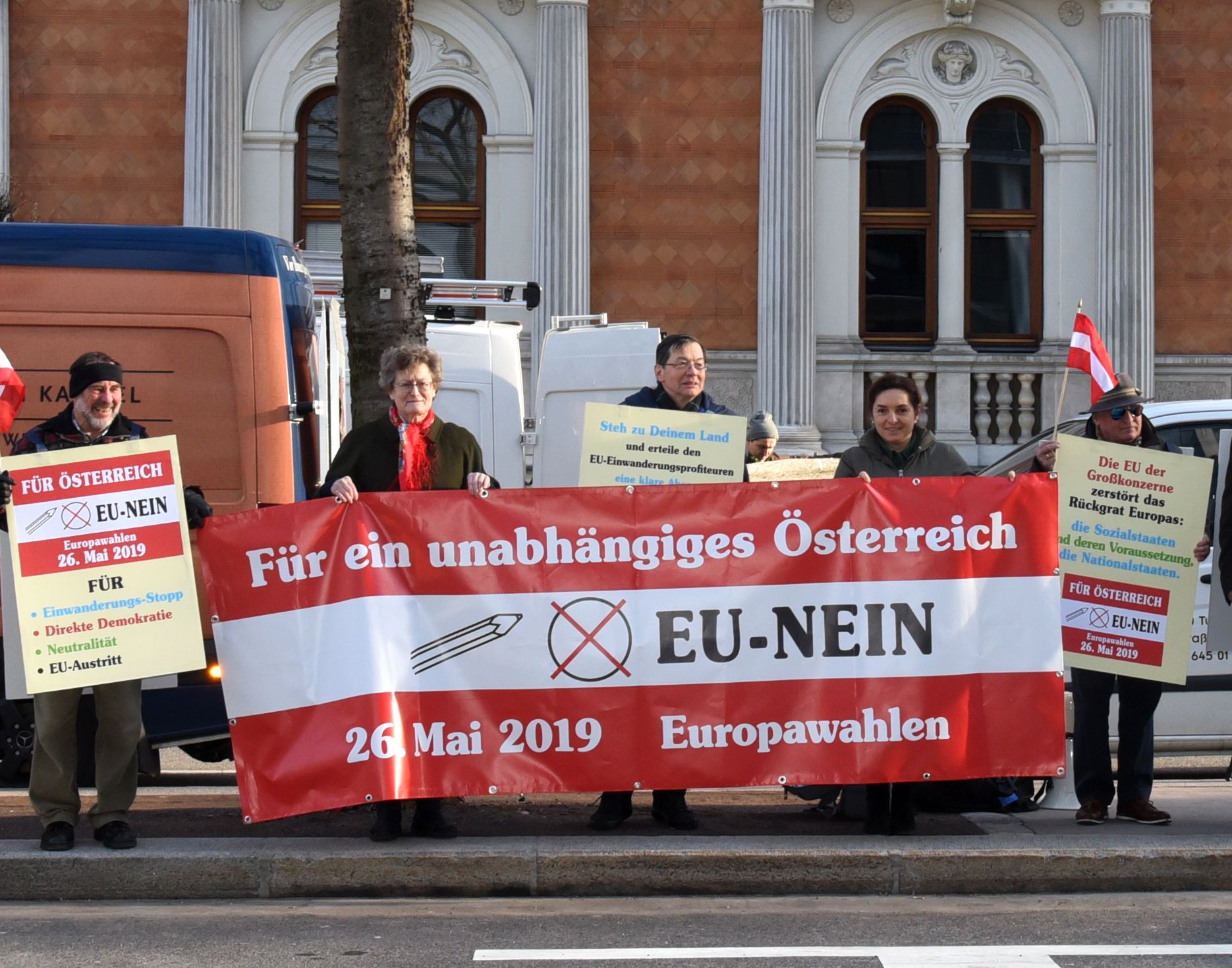 Das Wahlbündnis von zwei langjährig aktiven EU-kritischen Organisationen, der "Initiative Heimat & Umwelt" IHU und dem "Neutralen Freien Österreich" NFÖ, die mit einer gemeinsamen Kandidatur zur Europawahl vom 26.5.2019 mit dem Listen-Namen "EU-NEIN" antreten wollen, sammelt dzt. eifrig die nötigen Unterstützungsunterschriften vor den Gemeindeämtern und Stadtmagistraten - trotz häufigen Winterstürmen und für Arbeit im Freien kalten Temperaturen. Bündnis-Spitzenkandidatin Inge Rauscher, Obfrau der IHU, dazu: "Wir lassen uns trotz der enormen Ungerechtigkeit gegenüber den bestehenden Parlamentsparteien, die dies aufgrund der von ihnen gemachten Wahlgesetze nicht auf sich nehmen müssen, damit sie "unter sich" bleiben können, nicht entmutigen und vertrauen auf jene österreichischen Bürger, die die zunehmende Entmündigung aus "Brüssel" nicht mehr länger hinnehmen wollen."