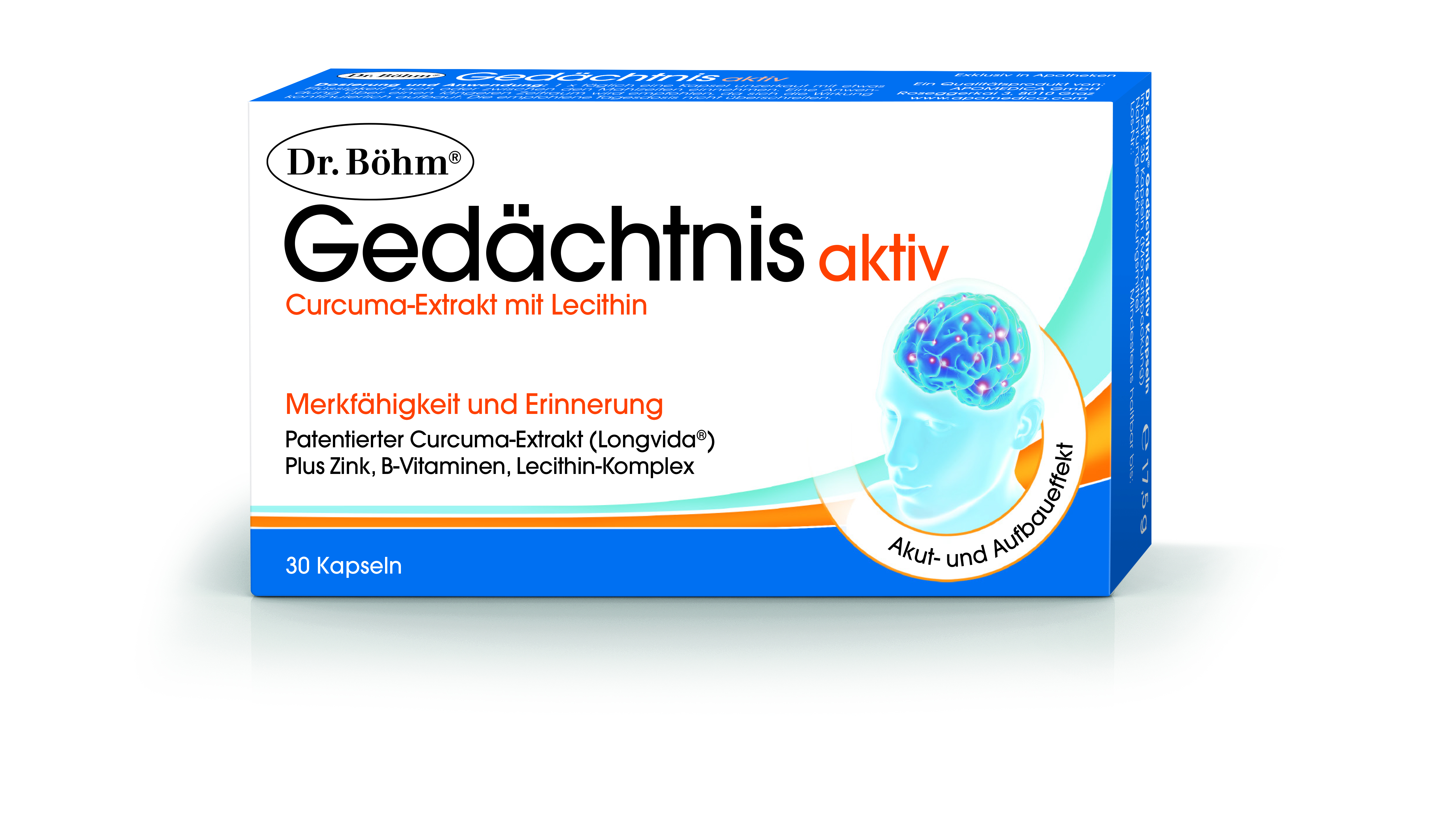 Dr. Böhm® Gedächtnis aktiv enthält nicht nur den patentierten Curcuma-Extrakt Longvida®, sondern auch andere wichtige ernährungsphysiologische Stoffe wie einen Lecithin-Komplex, B-Vitamine und Zink für Gehirn und Nerven. Eine regelmäßige Einnahme kann zu einem guten Gedächtnis und einer gesunden Gehirnalterung beitragen. Dr. Böhm® Gedächtnis aktiv ist ab sofort unter Pharmazentralnummer 4997881 exklusiv in der Apotheke erhältlich.