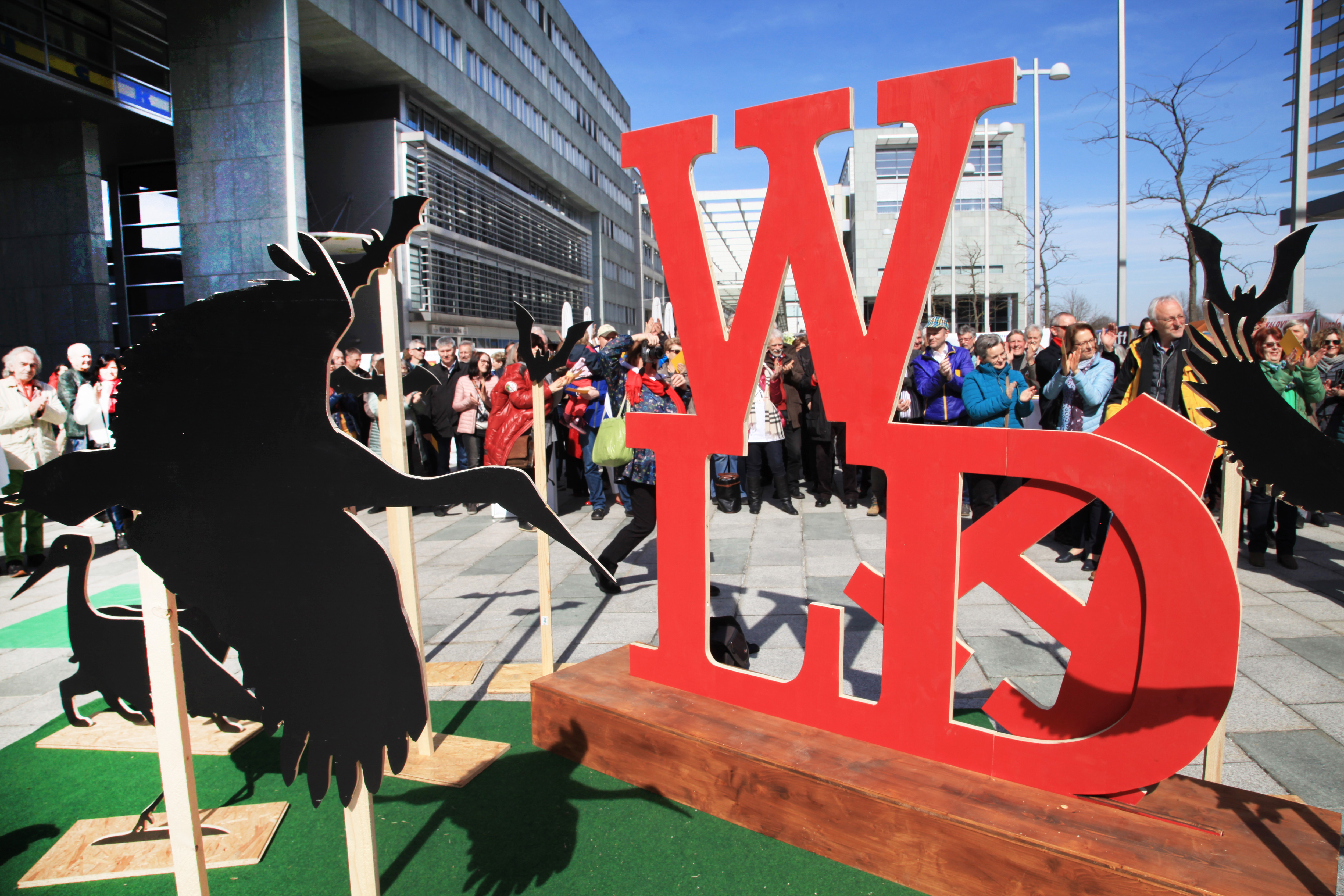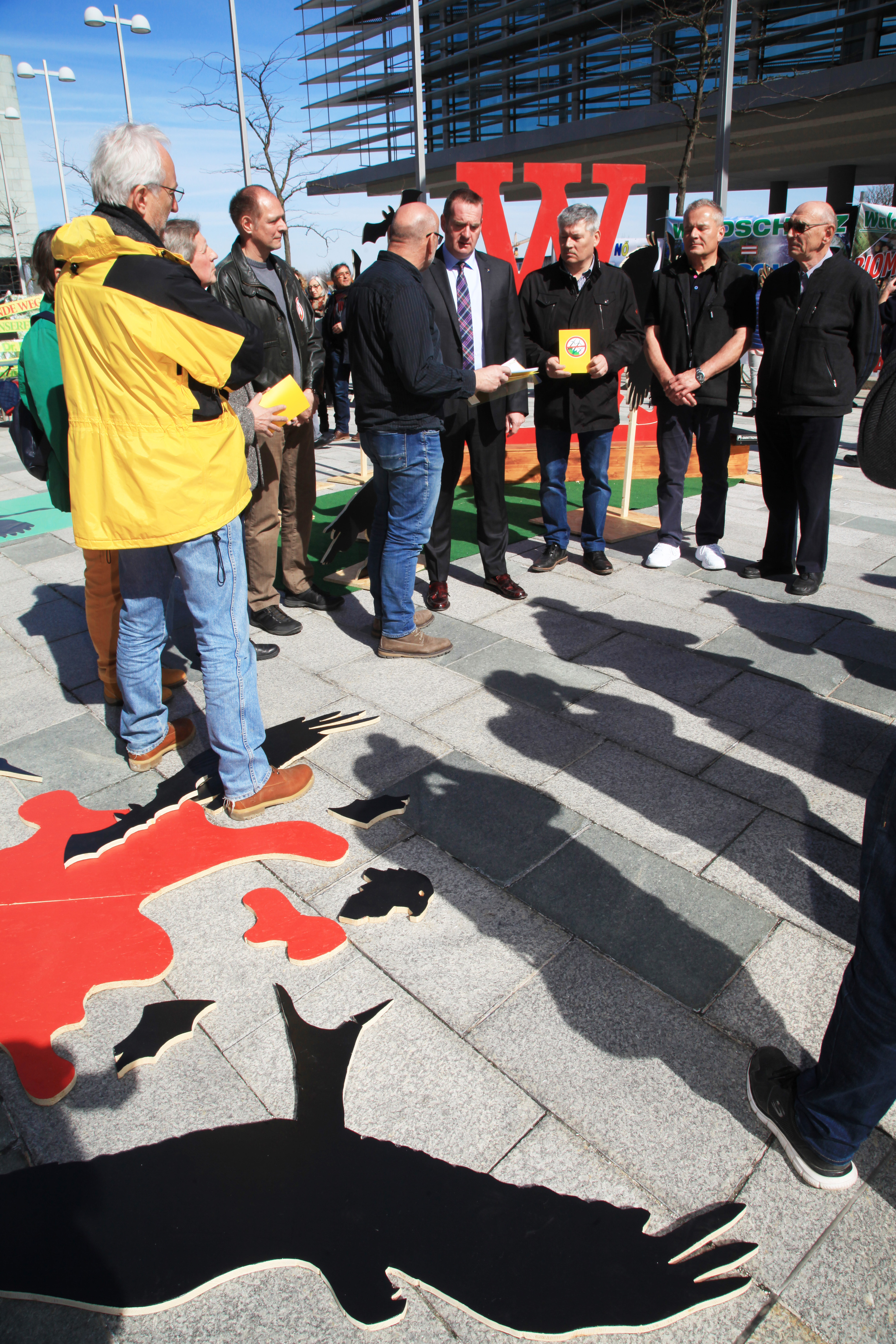 Ein überdimensionales W A L D Logo in Signalrot steht am Landhausplatz, Waldtiere gruppieren sich um die Skulptur. Der Buchstabe A ist verrutscht, der Wald ist in Gefahr. Zahlreiche Transparente untermauern die Forderungen und Kritiken.