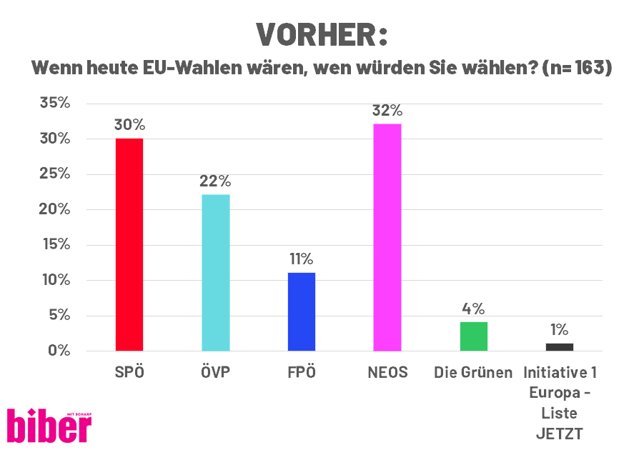 Klarer Wahlsieger sind NEOS mit 33%! Bei der ersten Generalprobe zur EU-Wahl konnte sich Claudia Gamon (NEOS) freuen - sie überzeugte die SchülerInnen der Vienna Business School Schönborngasse am meisten. Beim Schüler-Talk "EUda 2019" mit den EU-KandidatInnen Werner Kogler (GRÜNE), Johannes Voggenhuber (Initiative 1 Europa), Christian Zoll (ÖVP), Luca Kaiser (SPÖ), Georg Mayer (FPÖ) und Claudia Gamon (NEOS) wurde nicht nur heiß diskutiert. Auch erste Wahlergebnisse wurden präsentiert - mit "Vorher/Nachher"-Effekt. So verbuchten Grüne und Initiative 1 Europa nach der Diskussion deutliche Erfolge im Vergleich zur Abstimmung am Vortag: 10% für die Grünen (+6% zum Vortag) und 12% für Initiative 1 Europa (+11%). FPÖ rutschte von 11% auf 10% ab. Herbe Verluste erlebten SPÖ und ÖVP: SPÖ verlor ein Drittel der Stimmen und landete auf 20%. ÖVP erging es kaum besser - nach 22% am Vortag standen heute nur 15% zu Buche.