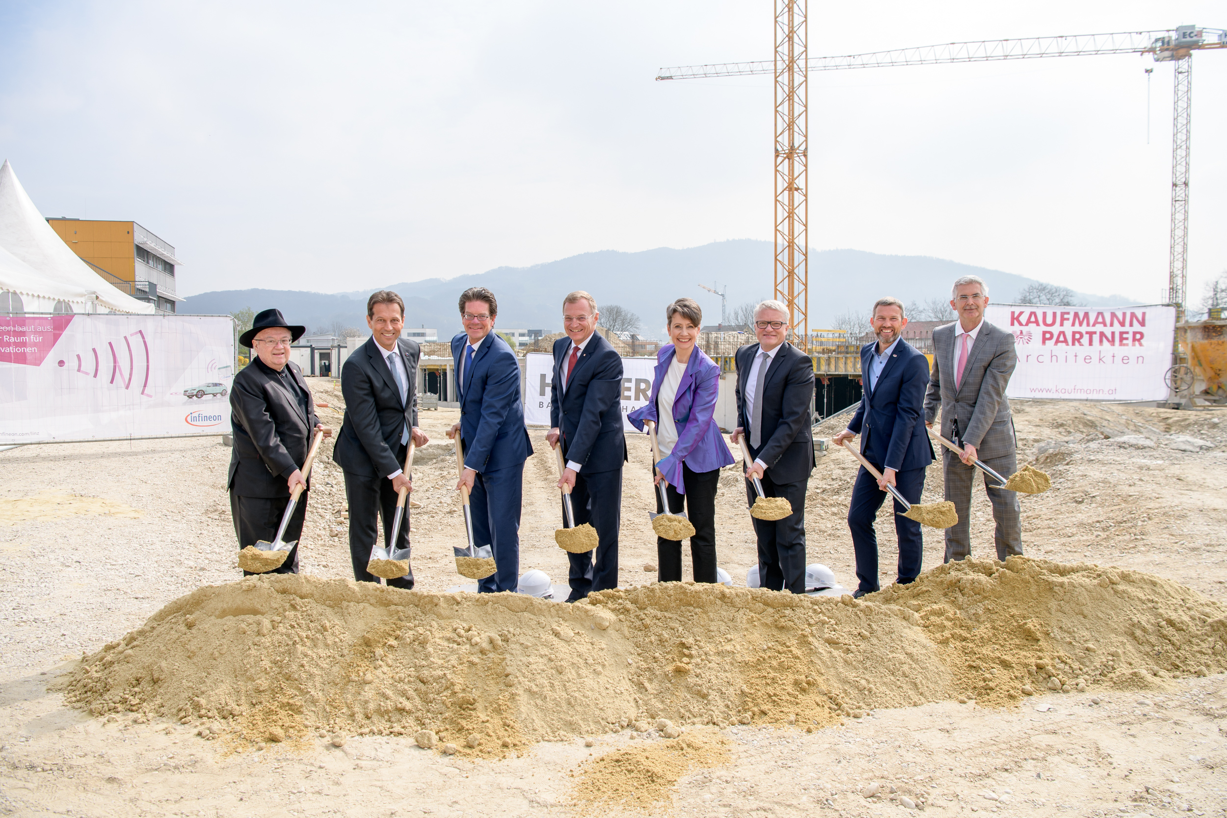 Sabine Herlitschka, Vorstandsvorsitzende von Infineon Technologies Austria AG, begrüßte beim offiziellen Spatenstich mit den DICE-Geschäftsführern Gerhard Riess, Manfred Ruhmer und Peter Zeiner unter anderem Oberösterreichs Landeshaupt­mann Mag. Thomas Stelzer, den Linzer Bürgermeister Klaus Luger, Peter Schiefer, Präsident der Automotive-Division des Infineon-Konzerns, den DICE-Gründer Univ.-Prof. Dr. Richard Hagelauer, den Vize-Rektor der Johannes Kepler Universität, Univ.-Prof. Dr. Alexander Egyed, sowie den Geschäftsführer der Industriellenvereinigung Oberösterreich, DI Dr. Joachim Haindl-Grutsch, und Mag. Doris Hummer, Präsidentin der Wirtschaftskammer Oberösterreich.