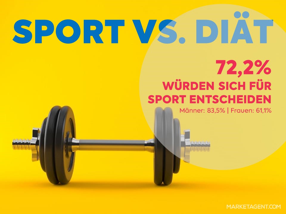 Im direkten Vergleich von Sport und Diät als Maßnahmen zur Gewichtsabnahme geht die Sportausübung als klarer Sieger hervor. Mehr als 7 von 10 Befragten würden die sportliche Betätigung dem Verzicht auf gewisse Nahrungsmittel vorziehen. Besonders bei Männern ist der Sport mit knapp 84% der klare Favorit