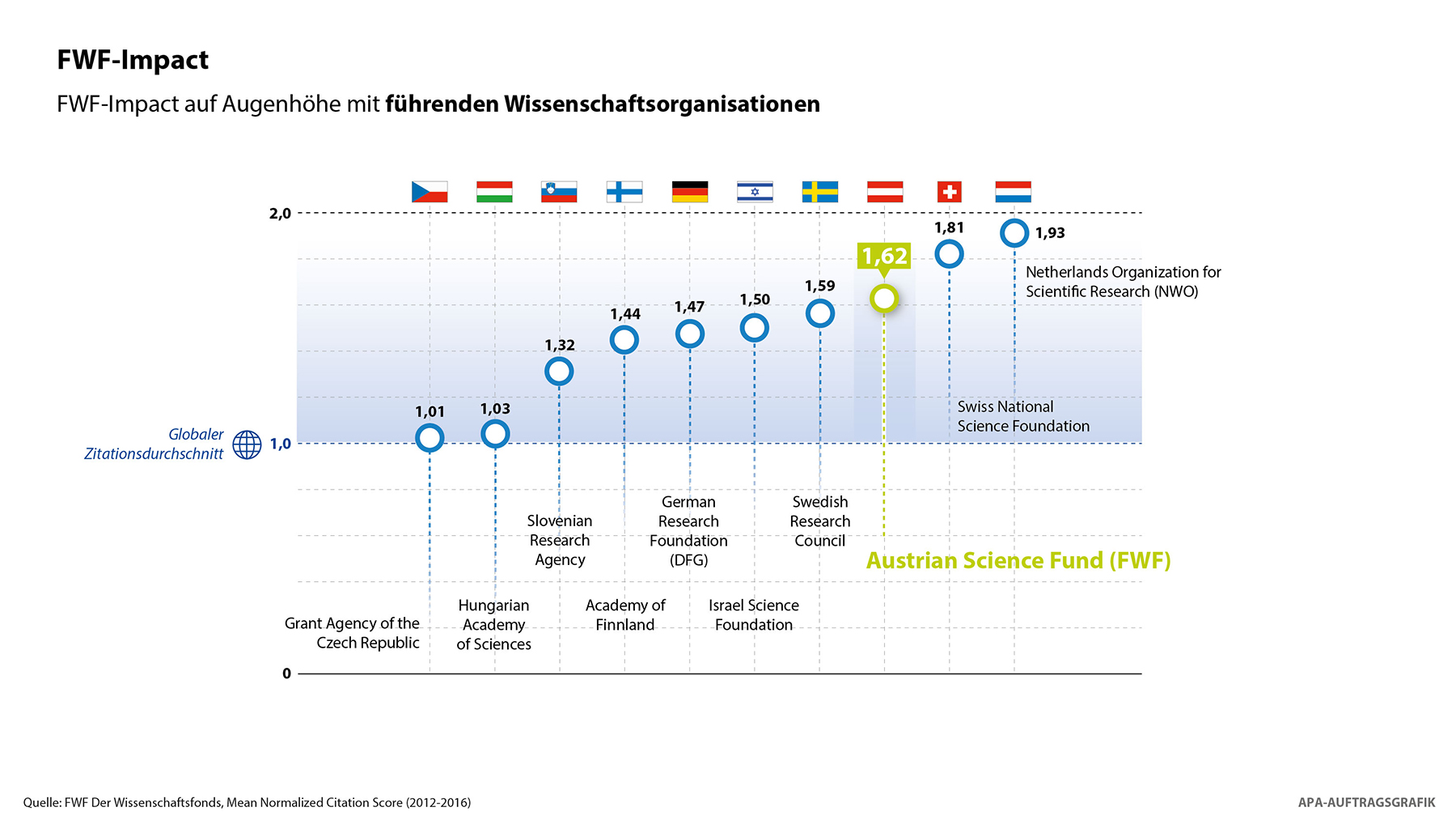 FWF-Präsident Klement Tockner betonte die hohe Hebelwirkung von im Wettbewerb vergebener Mittel. Nur auf diese Weise könne man höchste Qualität garantieren und Österreich als Wissenschafts- und Wirtschaftsstandort an die Weltspitze heranführen. „Unabhängige Studien belegen eindrucksvoll den höheren Output von Forschungsprojekten, die über den Wettbewerb finanziert werden“, so Tockner. Die Qualität der vom FWF geförderten Projekte sind auf Augenhöhe mit Innovation Leadern wie Schweden oder Israel (siehe Infografik). Aktuelle Zahlen weisen dem FWF eine hervorragende Input-Output-Wirkung aus: „Mit zwei Prozent aus den gesamten F&E-Ausgaben entstehen 50 Prozent der österreichischen Top-Publikation. Besser kann man einen Euro nicht einsetzen“, so Tockner abschließend (siehe Infografik).