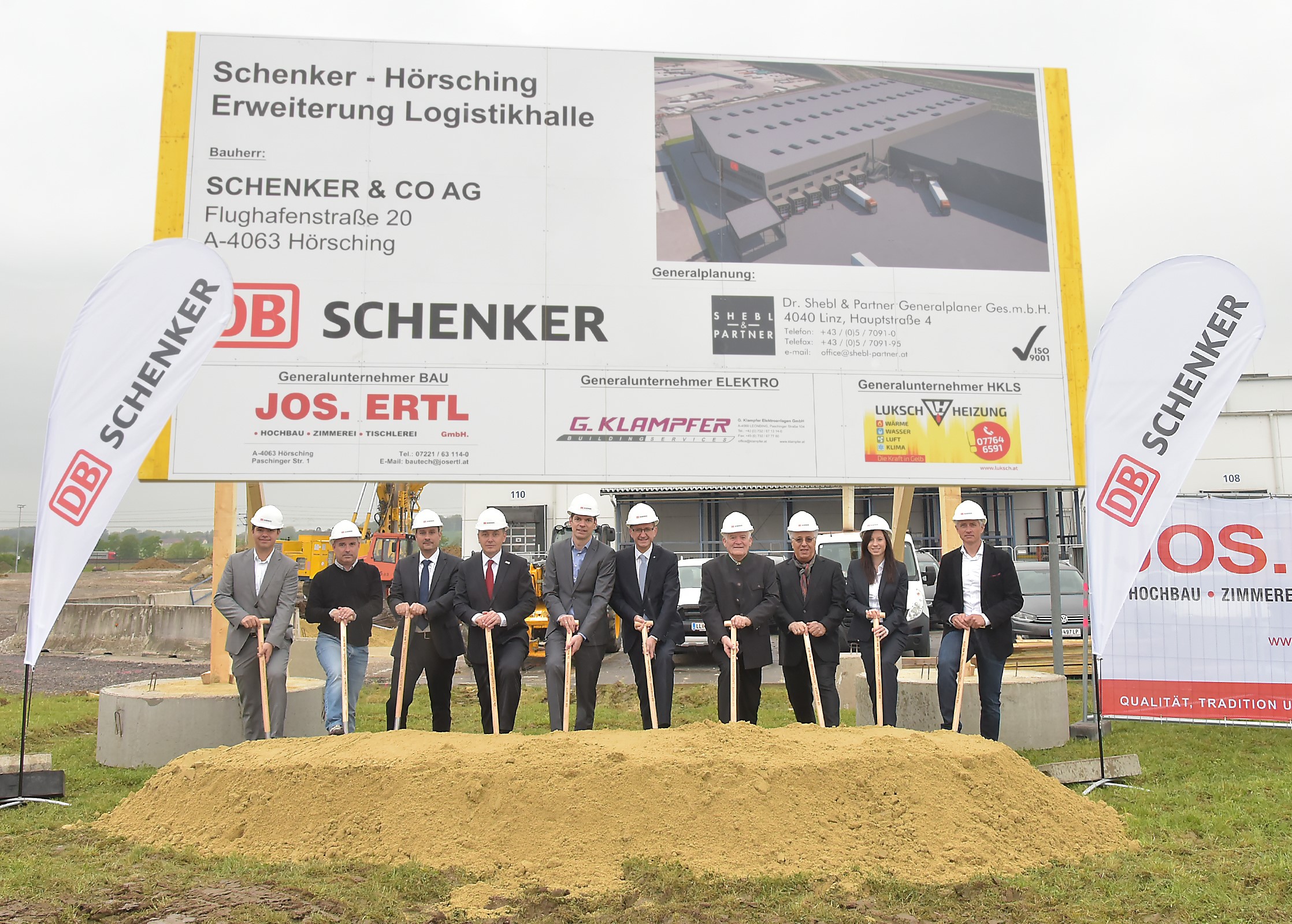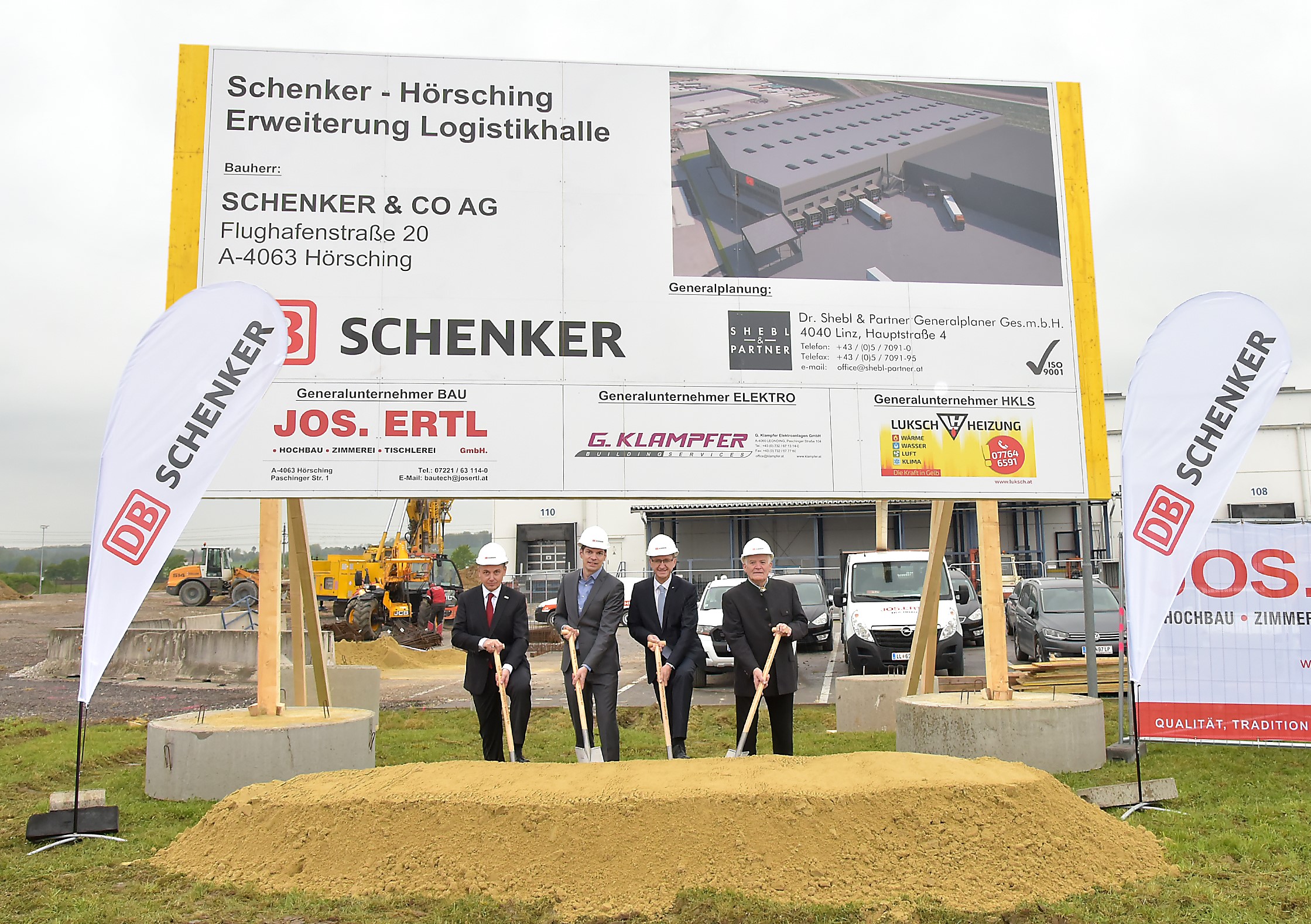 (Wien; Linz Hörsching, 15. Mai 2019) Mit einem feierlichen Spatenstich setzten heute Markus Achleitner, Wirtschaftslandesrat von Oberösterreich, und Gunter Kastler, Bürgermeister von der Marktgemeinde Hörsching, gemeinsam mit Mag. Alexander Winter, CEO von DB Schenker in Österreich und Südosteuropa, und Mag. (FH) Thomas Ziegler, Geschäftsführer von DB Schenker in Linz Hörsching, den offiziellen Startschuss für die Erweiterung des Standortes. Mit der neuen 6.000 Quadratmeter großen Logistikhalle, die am Standort Linz Hörsching errichtet wird, vergrößert DB Schenker seine Logistikfläche auf über 29.000 Quadratmeter. Die Fertigstellung ist bis Ende 2019 geplant, das Investitionsvolumen beträgt rund 7 Millionen Euro.
