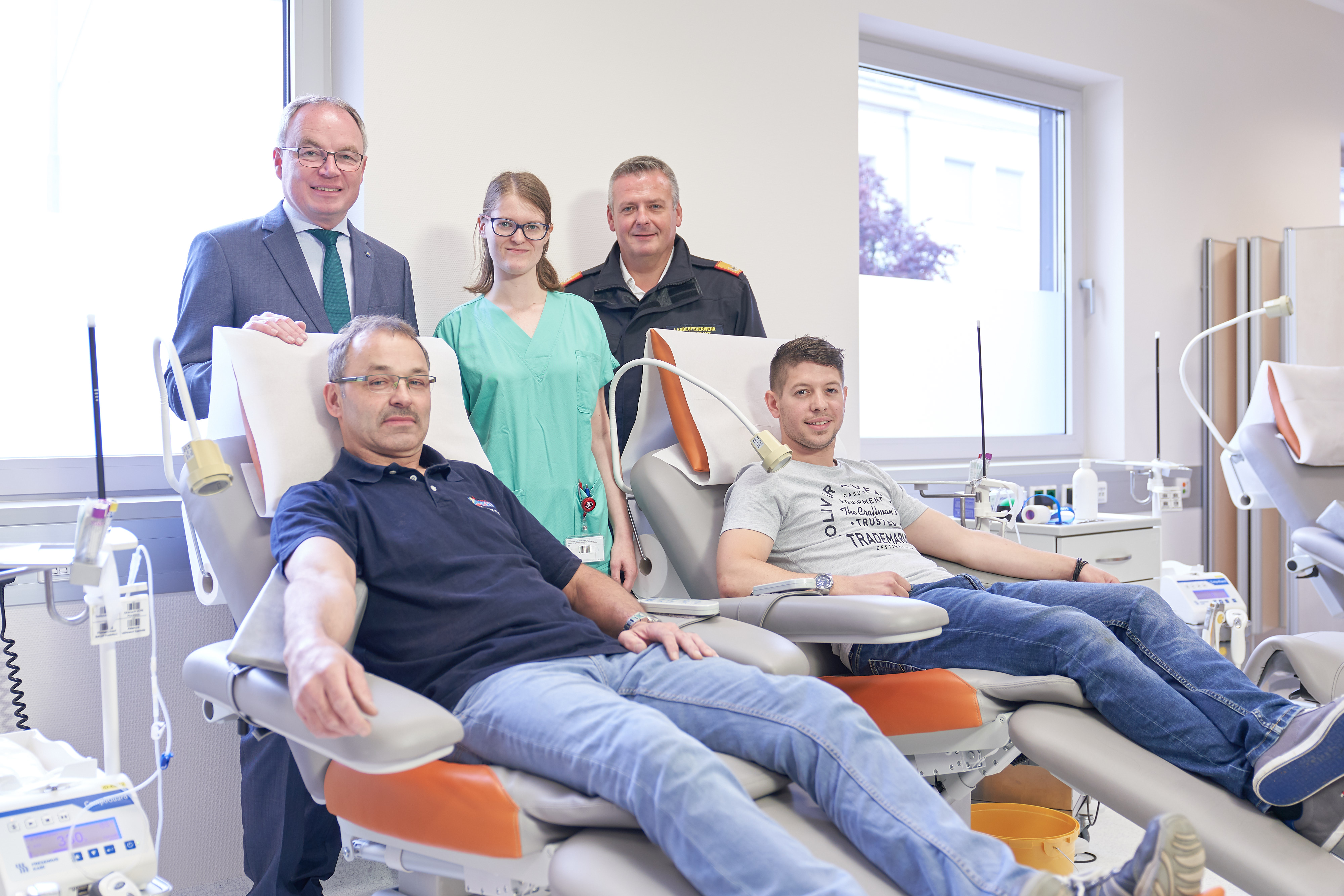 LH-Stellvertreter Dr. Stephan Pernkopf, BMA Daniela Stamminger und Landesfeuerwehrkommandant von Niederösterreich, Dietmar Fahrafellner, MSc mit den beiden Blutspendern Franz Seiberl (links) und Stefan Gradinger (rechts)