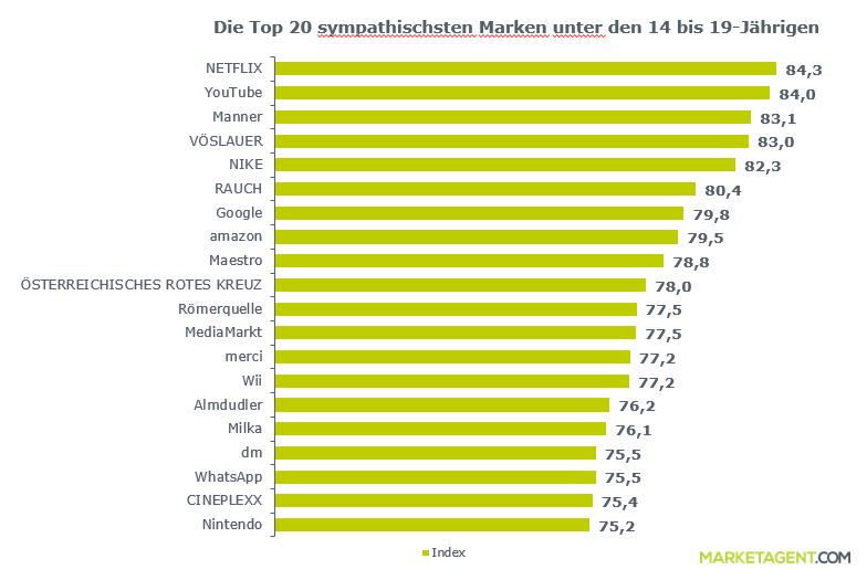 Doch es gibt auch eine gute Nachricht für die heimische Wirtschaft: Traditionelle Marken wie Manner, Vöslauer oder Rauch stehen auch beim Konsumentennachwuchs hoch im Kurs und sind unter den Top 6 anzutreffen. Mit dem Österreichischen Roten Kreuz, Römerquelle und Almdudler sind sogar noch drei weitere „Österreicher“ im Ranking der 20 sympathischsten Brands zu finden
