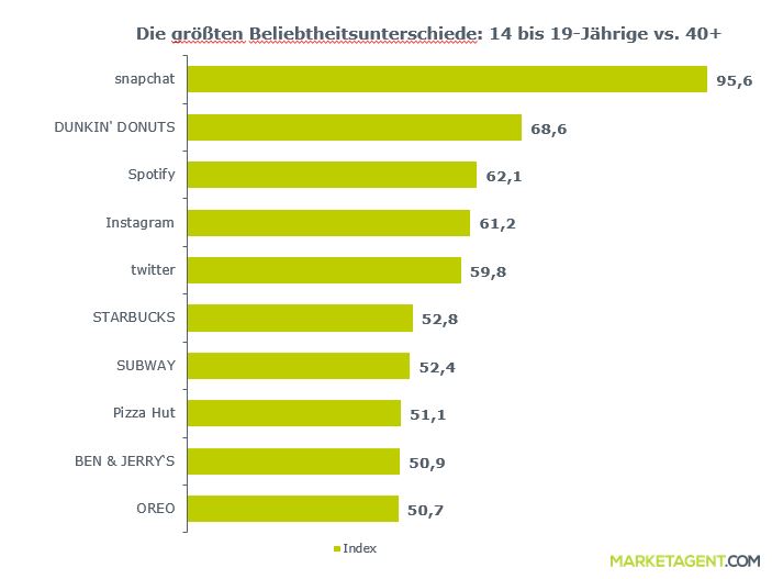 Ein Generationenvergleich bringt die Präferenzen der 14 bis 19-Jährigen noch klarer zum Ausdruck (Abbildung 2). Verglichen mit den Sympathie-Trends der 40 plus-Jährigen wird die Bedeutung von sozialen Netzwerken und Streamingdiensten bei den Teenies noch deutlicher. Mit großem Abstand an der Spitze: snapchat. Auf den Rängen 3 bis 5 folgen Spotify, Instagram und twitter.