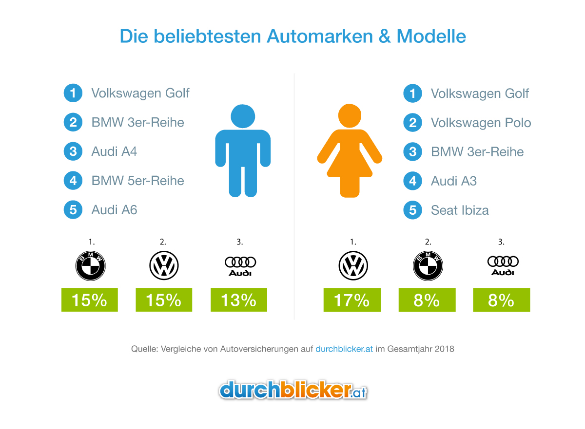 Österreichs Männer fahren BMW, Frauen stehen auf VW. Bei den