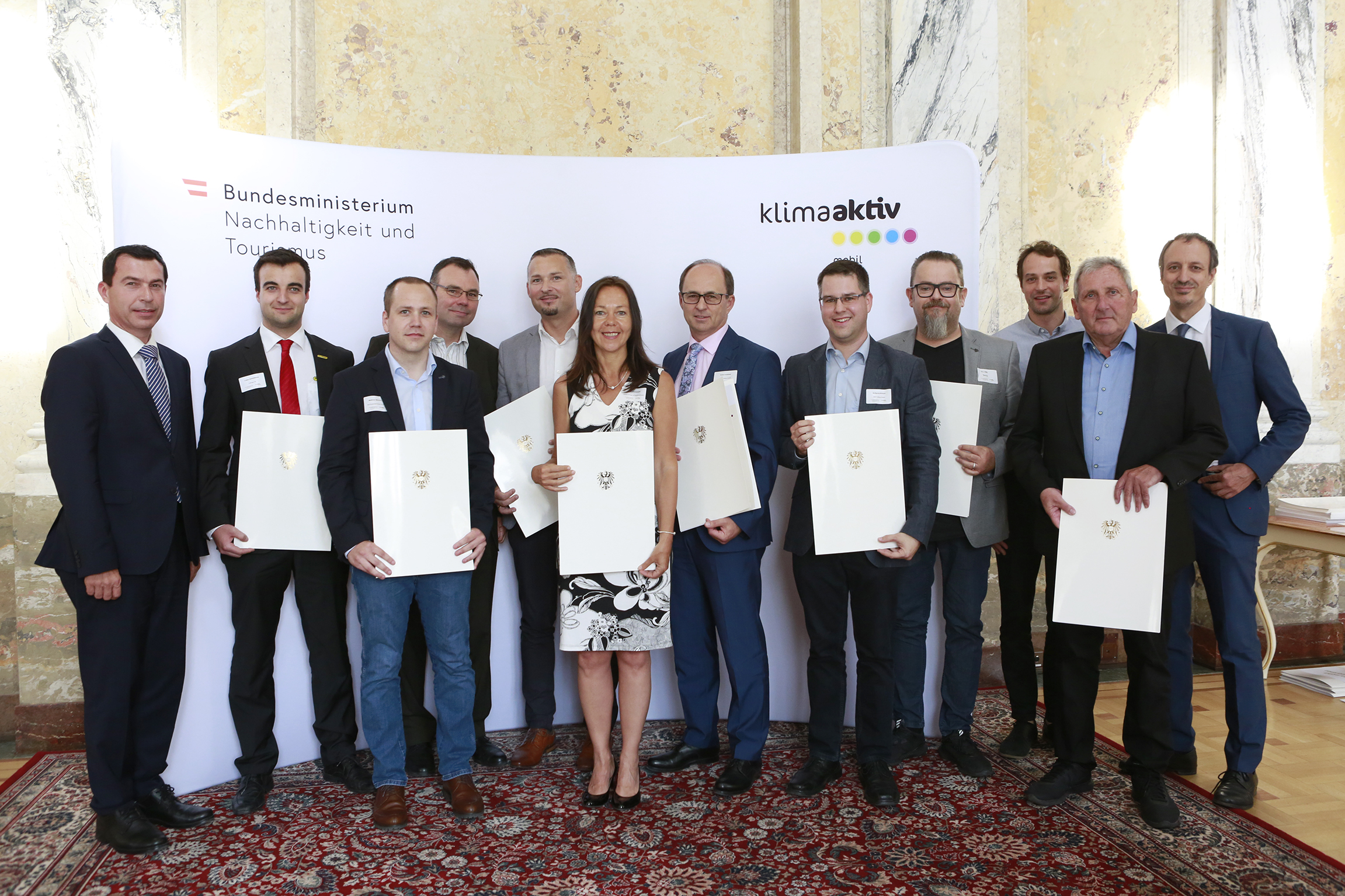 Das Bundesministerium für Nachhaltigkeit und Tourismus (BMNT) hat am Montag 19 vorbildliche Betriebe aus ganz Österreich ausgezeichnet, die sich im Rahmen der Klimaschutz-Mitmachinitiative klimaaktiv mobil engagieren. Jürgen Schneider, Leiter der Sektion IV Klima im BMNT, überreichte den angereisten klimaaktiv mobil Partnerinnen und Partnern im Marmorsaal des BMNT persönlich ihre Urkunden.